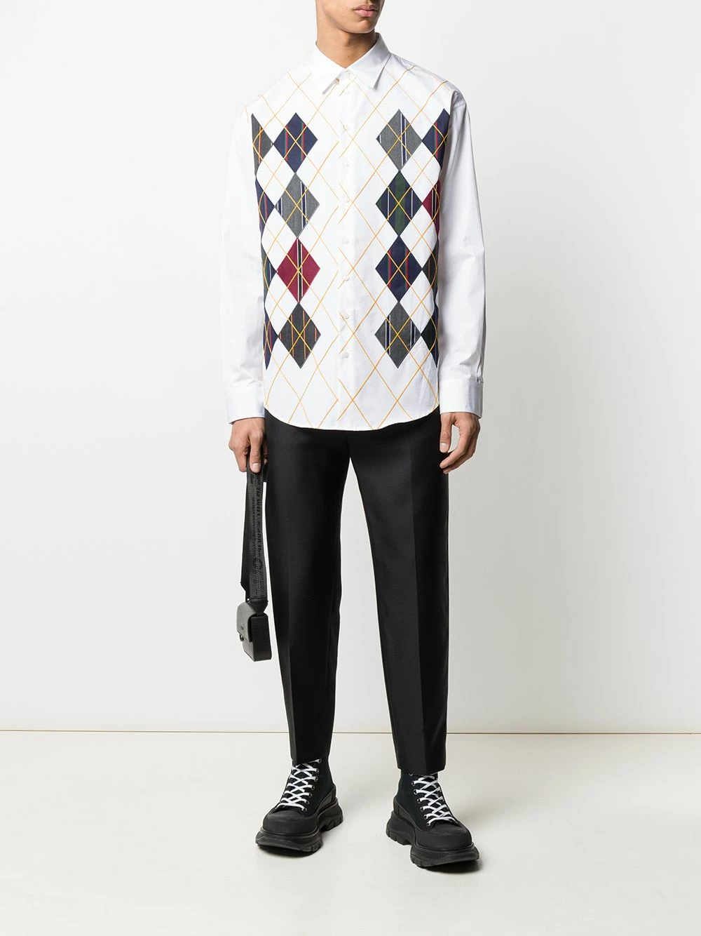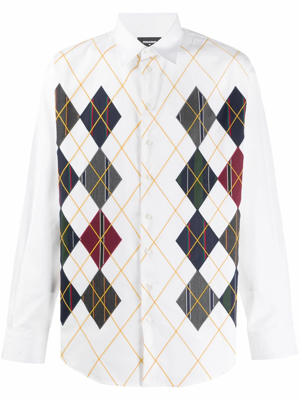 Chemise à motifs de losanges en coton Dsquared2 avec col pointu, boutonnière sur le devant, manches longues et poignets boutonnés. Couleur : blanc.