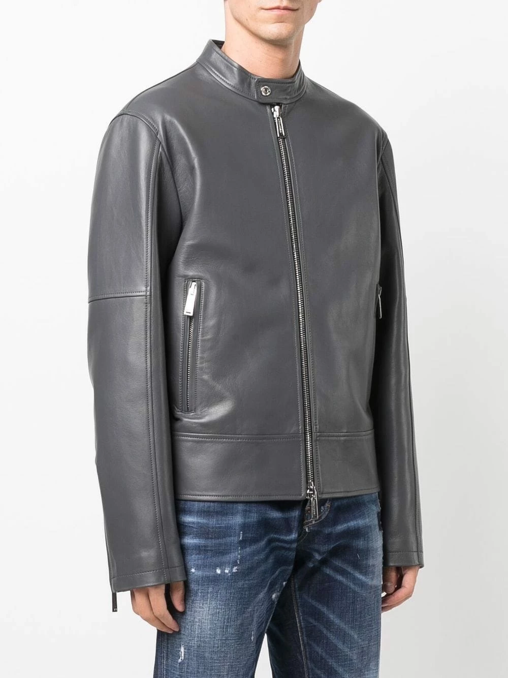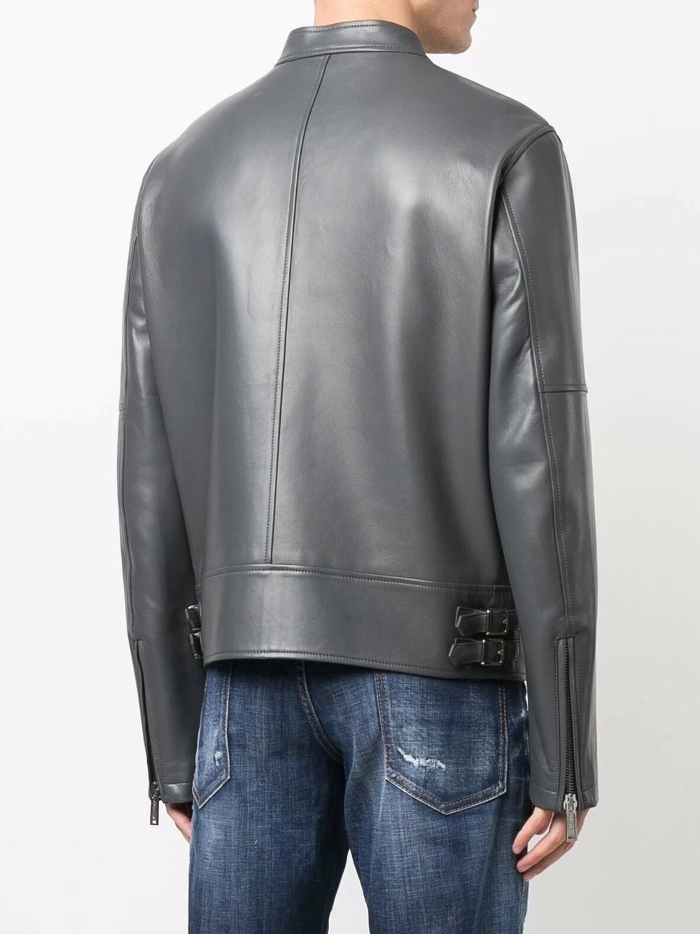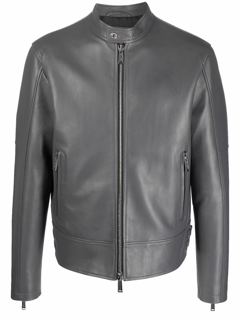 Texture grainée, col boutonné, poches à fermeture zippée devant, fermeture zippée devant, manches longues, poignets zippés. Couleur : gris. Matière : cuir.