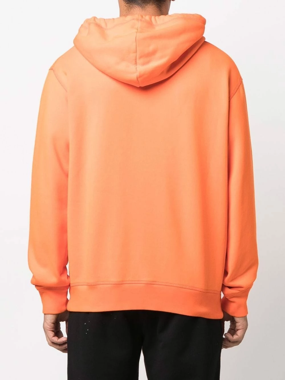 Logo imprimé sur le devant, capuche à lien de resserrage, effet d’épaules descendues, manches longues, détail nervuré. Couleur : orange. Matière : coton.