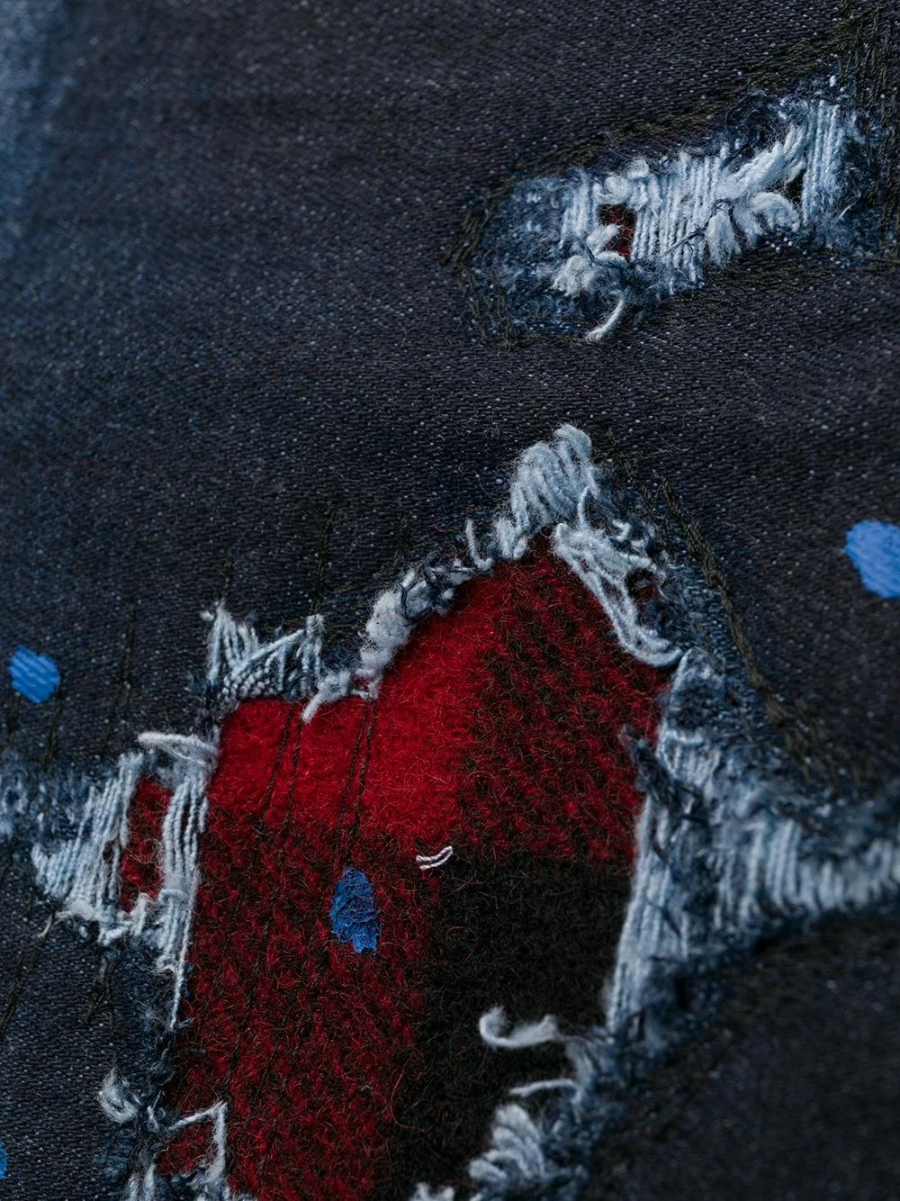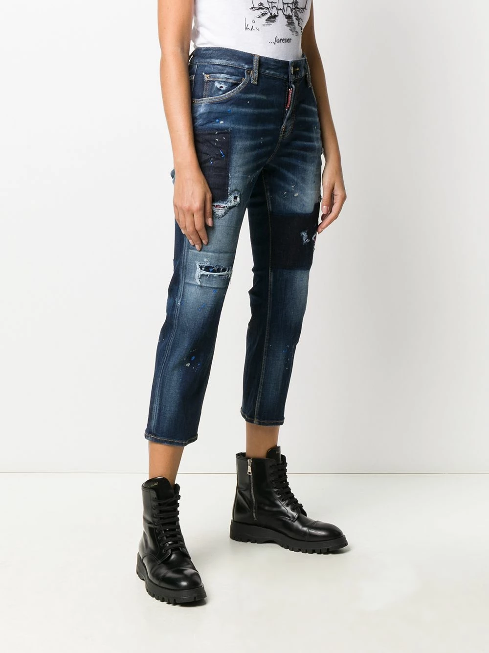 Effet usé, détails d’empiècements, finitions effilochées, passants de ceinture, fermeture à zip et boutons sur le devant, poches latérales arrondies, longueur crop, patch logo sur l’arrière, poches arrière plaquées. Couleur : bleu. Matière : coton.
