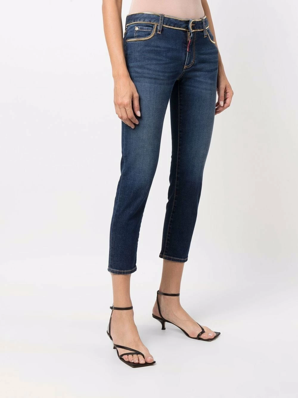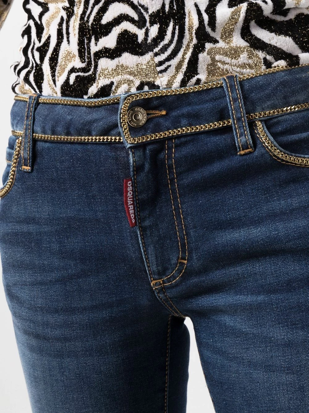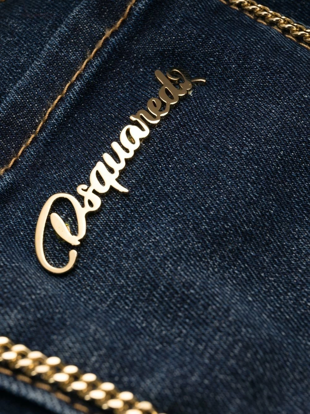 Taille basse, passants de ceinture, bordures en chaîne, finitions en métal doré, fermeture à zip et boutons sur le devant, cinq poches classiques, logo lettre, coupe courte, finitions à effet usé sur les cuisses, effet délavé. Couleur : bleu.