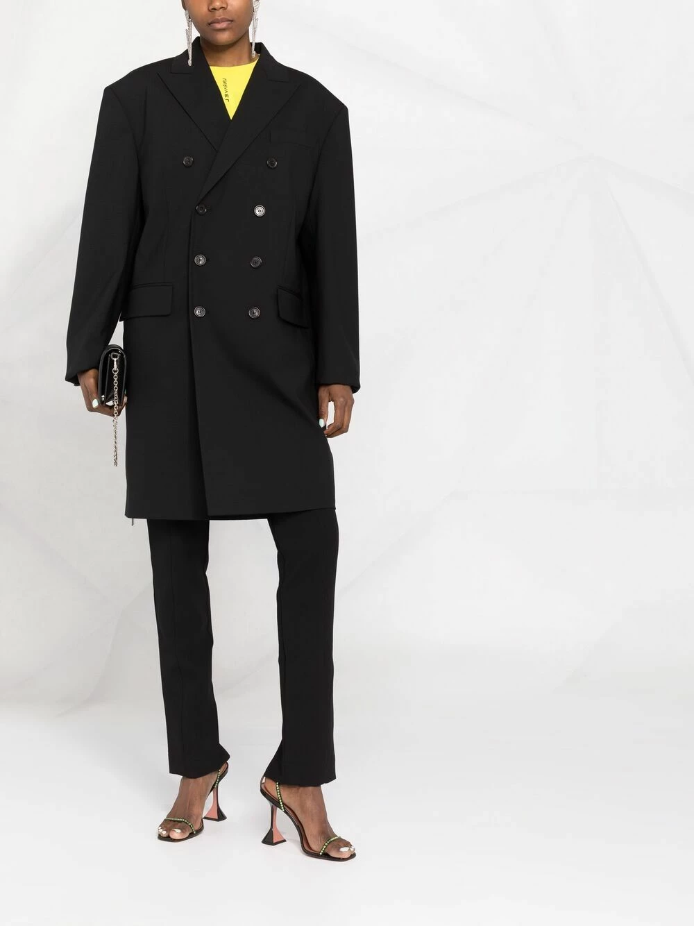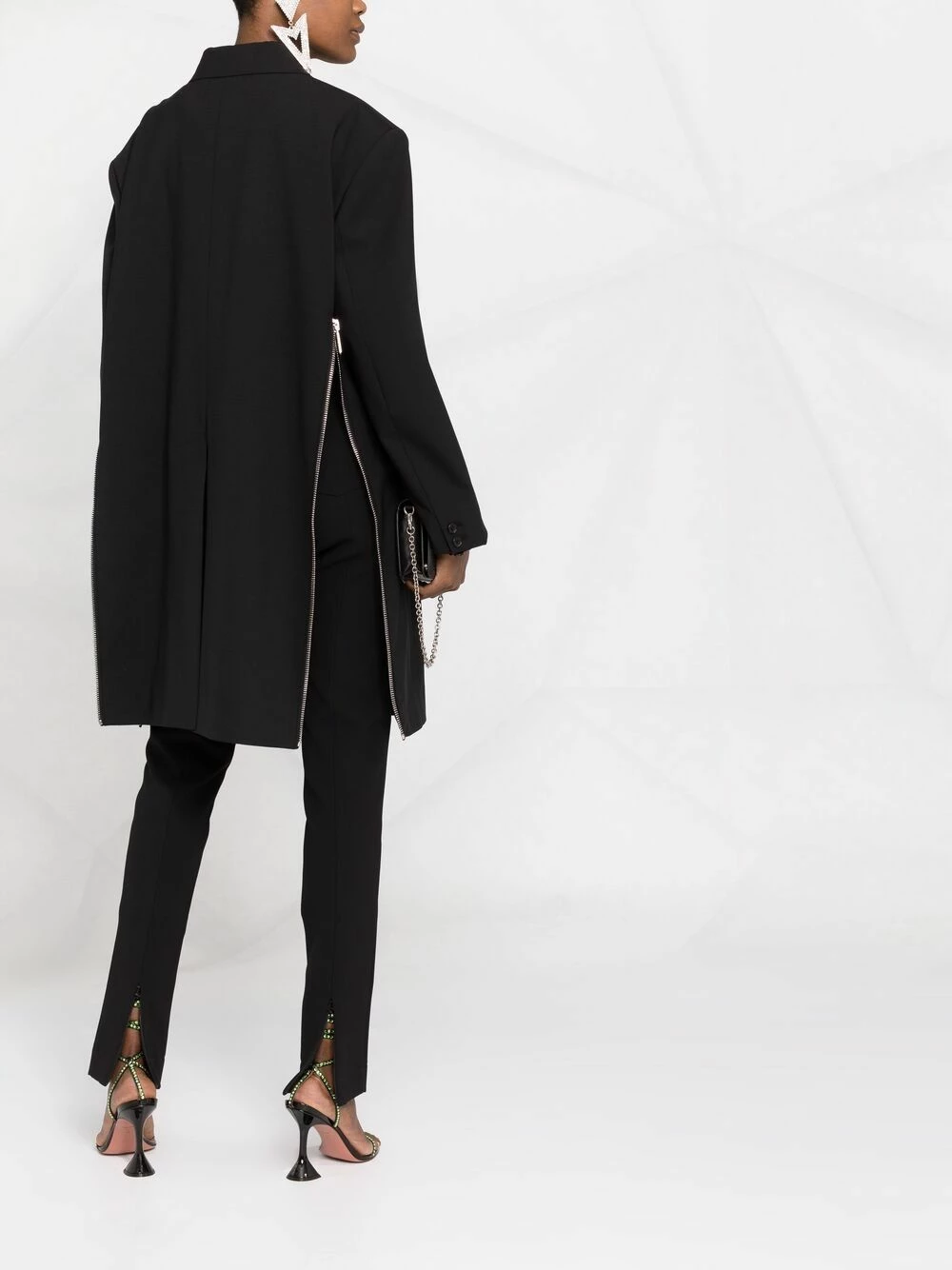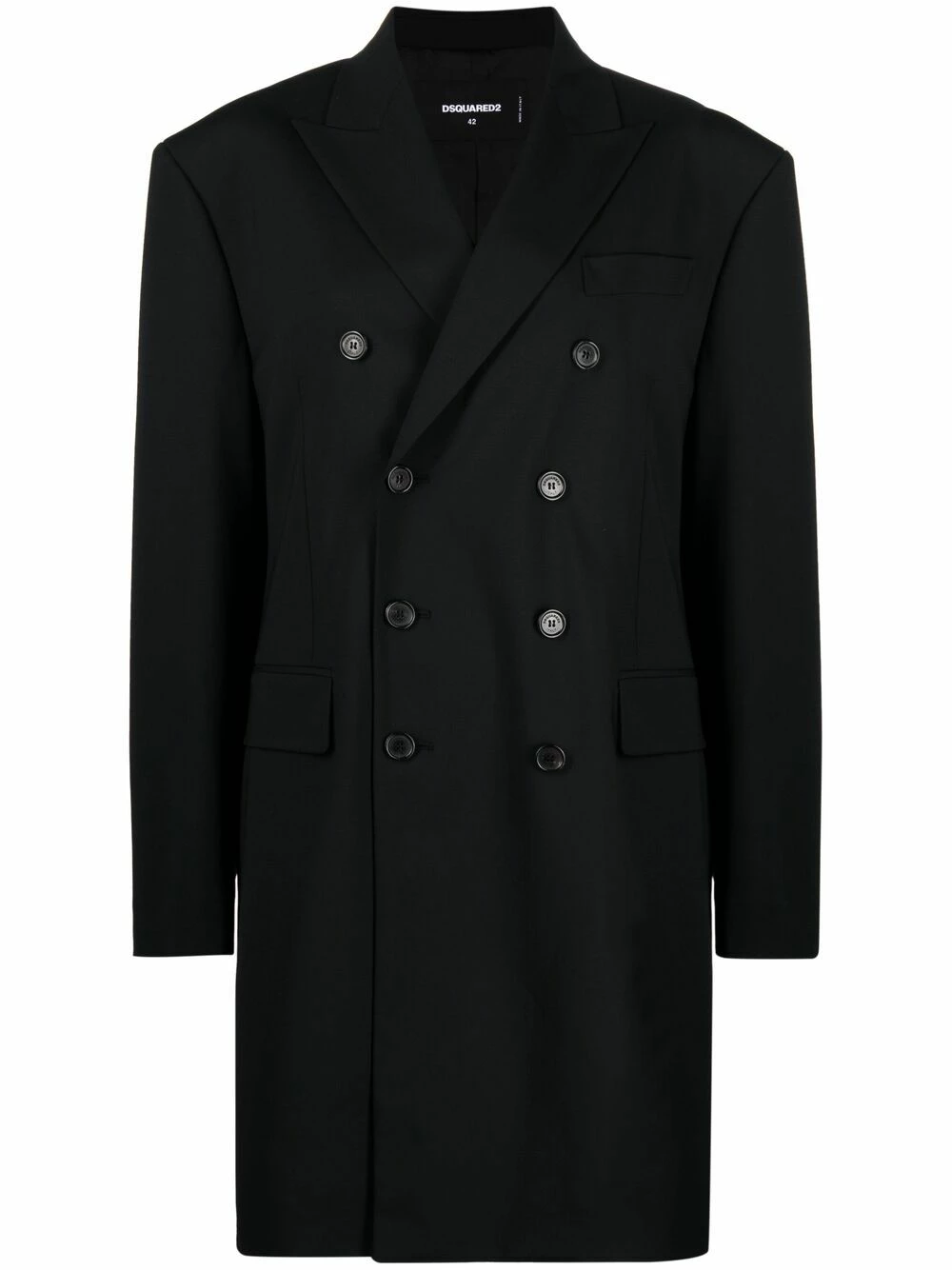 Détails zippés, épaulettes, revers pointus, boutonnière croisée, manches longues, poche passepoilée sur la poitrine, deux poches latérales à rabat, coupe mi-longue. Couleur : noir.