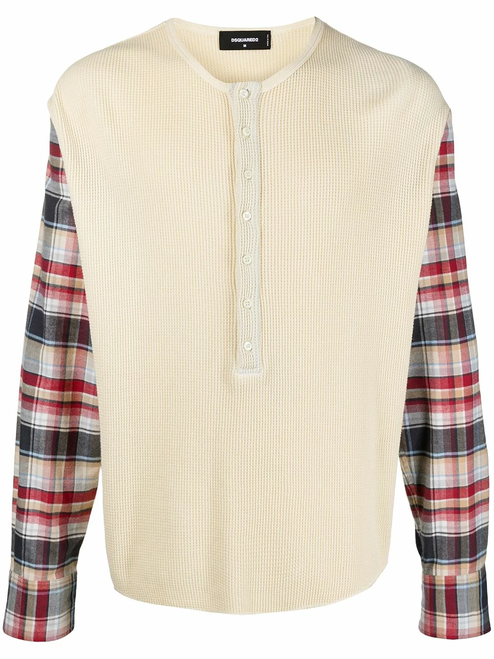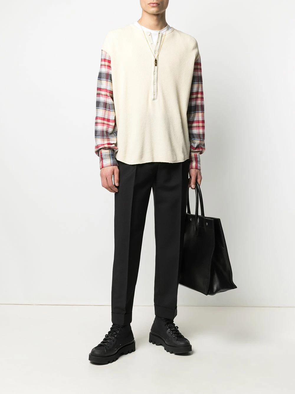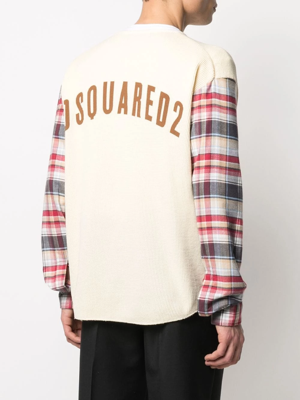 Design tricoté, tricot gaufré, logo imprimé à l’arrière, manches à carreaux, encolure ronde, boutonnière sur le devant. Matière : coton.