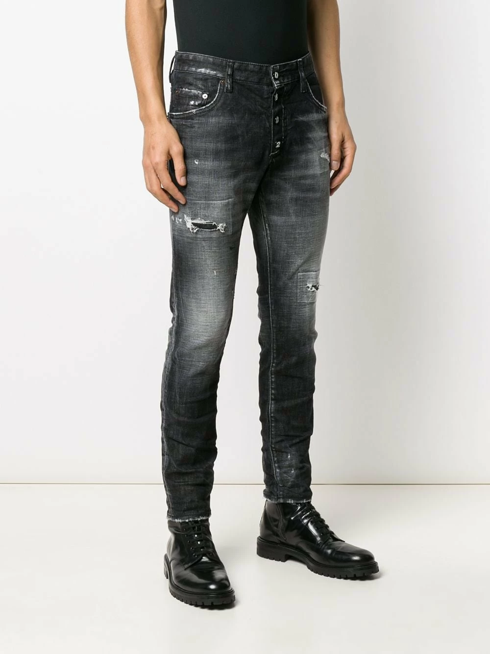 Jean slim à effet usé Dsquared2 avec coupe slim, finitions à effet usé, taille haute, coupe droite, coupe classique cinq poches, patch à logo à l’arrière, passants de ceinture et braguette boutonnée.