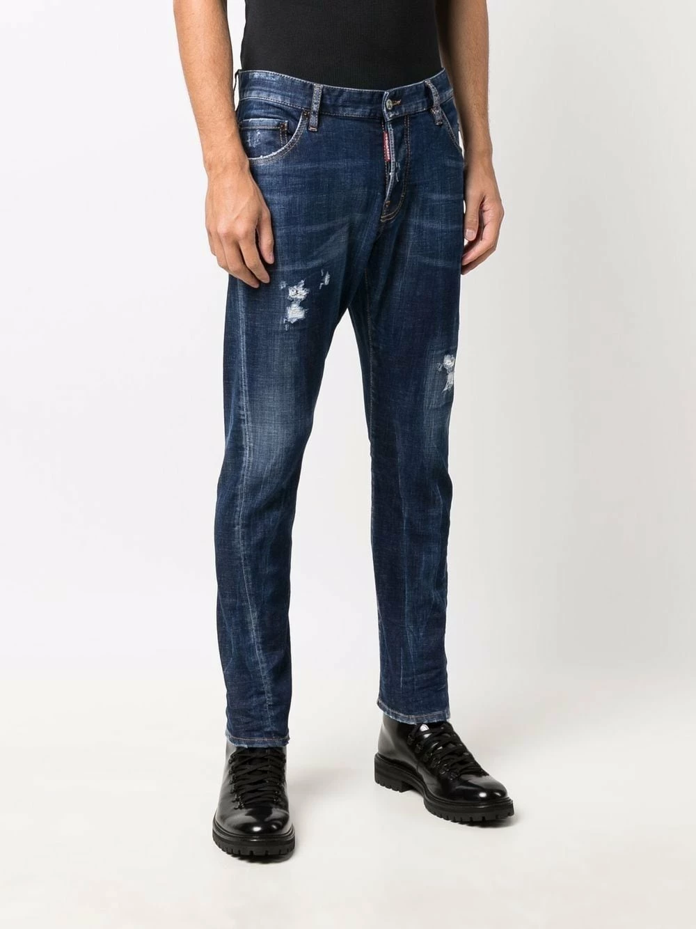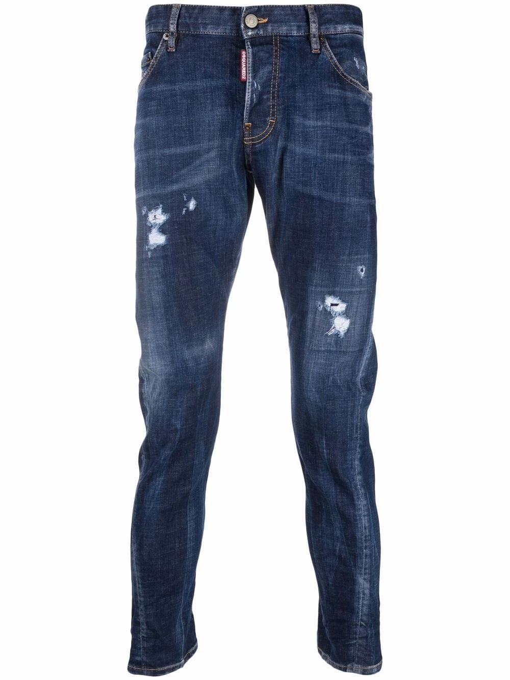 Bleu marine, effet usé, taille basse, fermeture boutonnée, passants de ceinture, coupe slim.