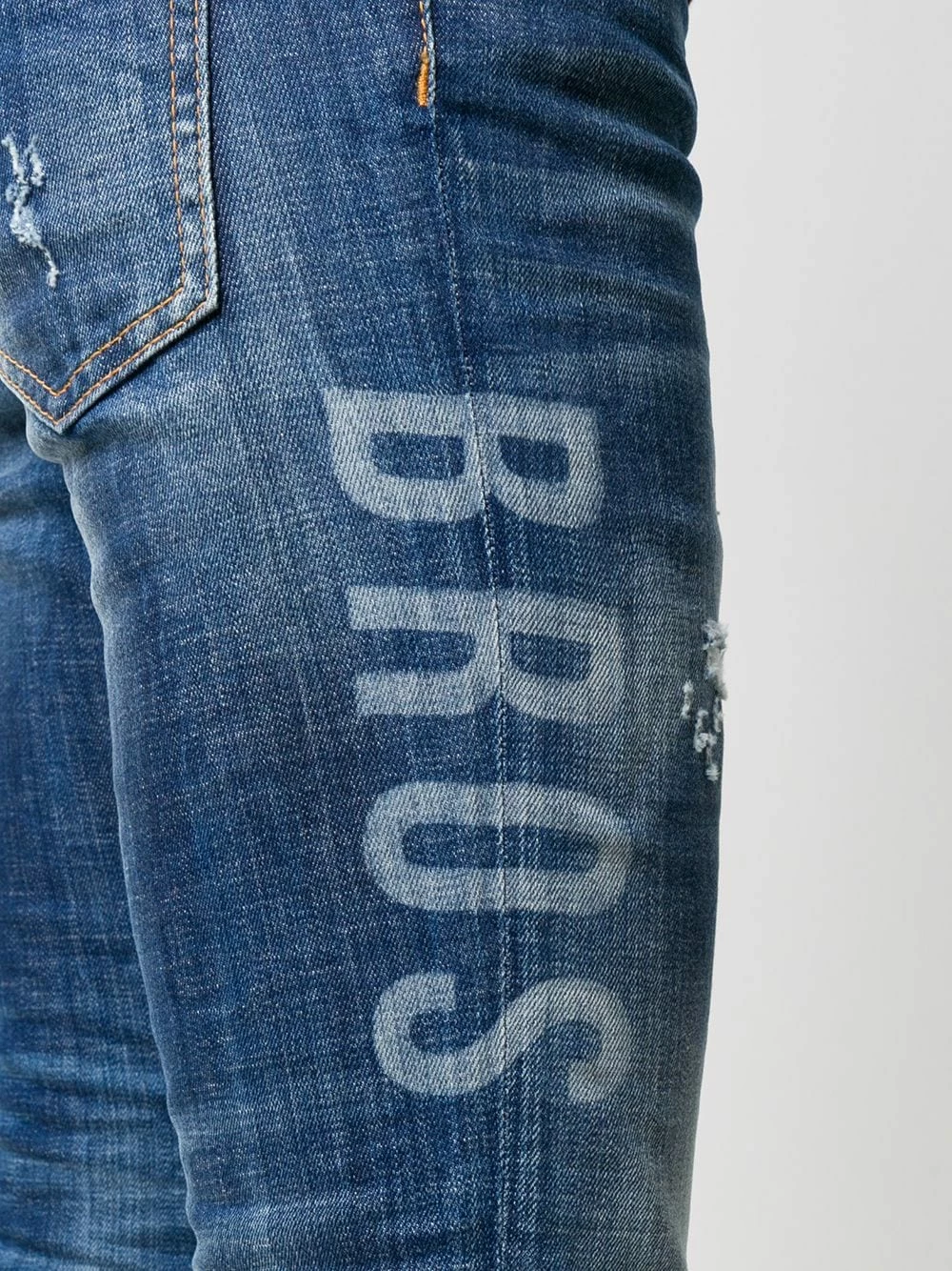 Fermeture boutonnée, effet usé, longueur crop, slogan imprimé à larrière. Couleur : bleu. Matière : coton.