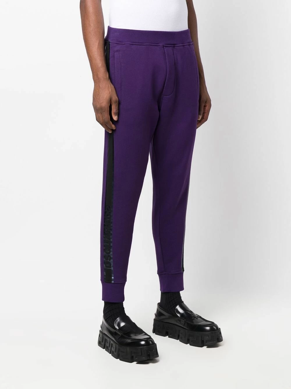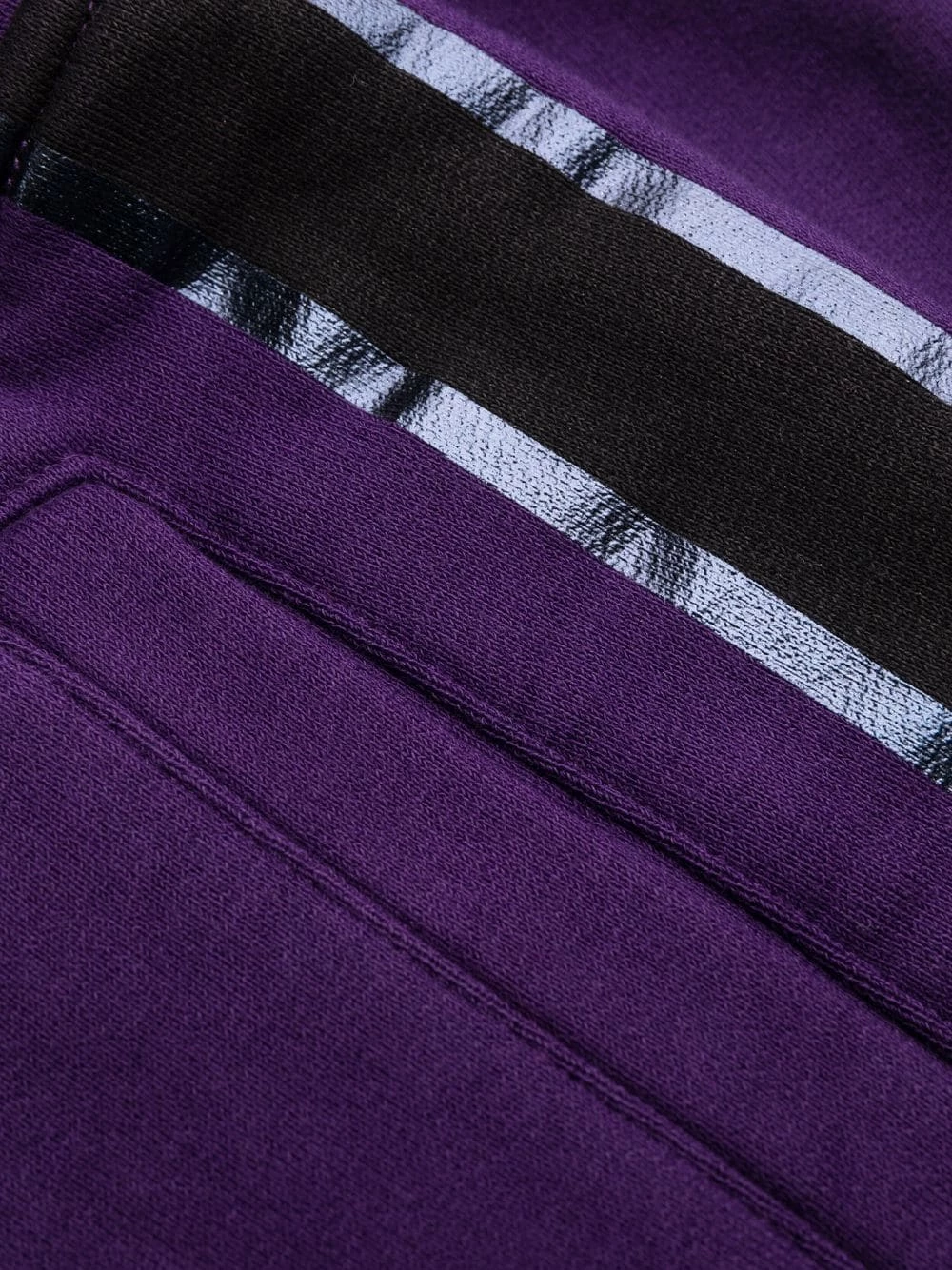 Détail de rayure latérale, coupe fuselée, poignets nervurés, deux poches latérales fendues, ceinture élastique. Couleur : violet. Matière : coton.