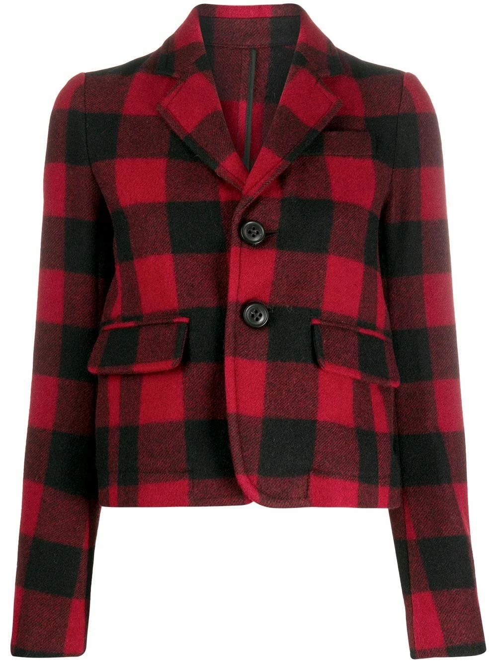 Carreaux, boutonnière sur le devant, col v, manches longues, deux poches plaquées avant, silhouette ajustée.