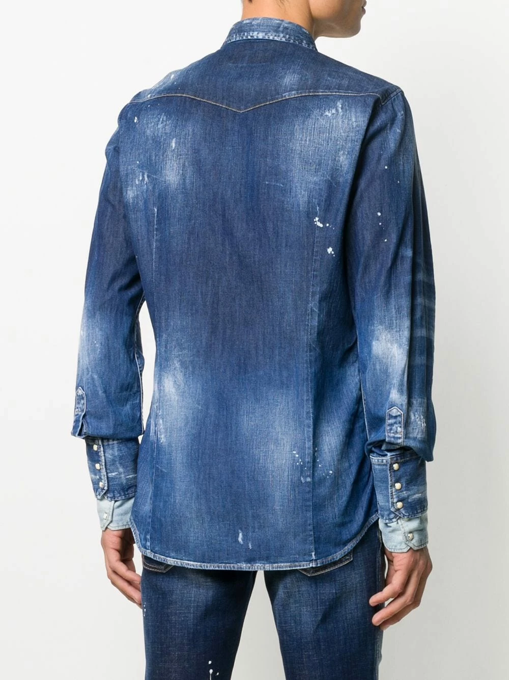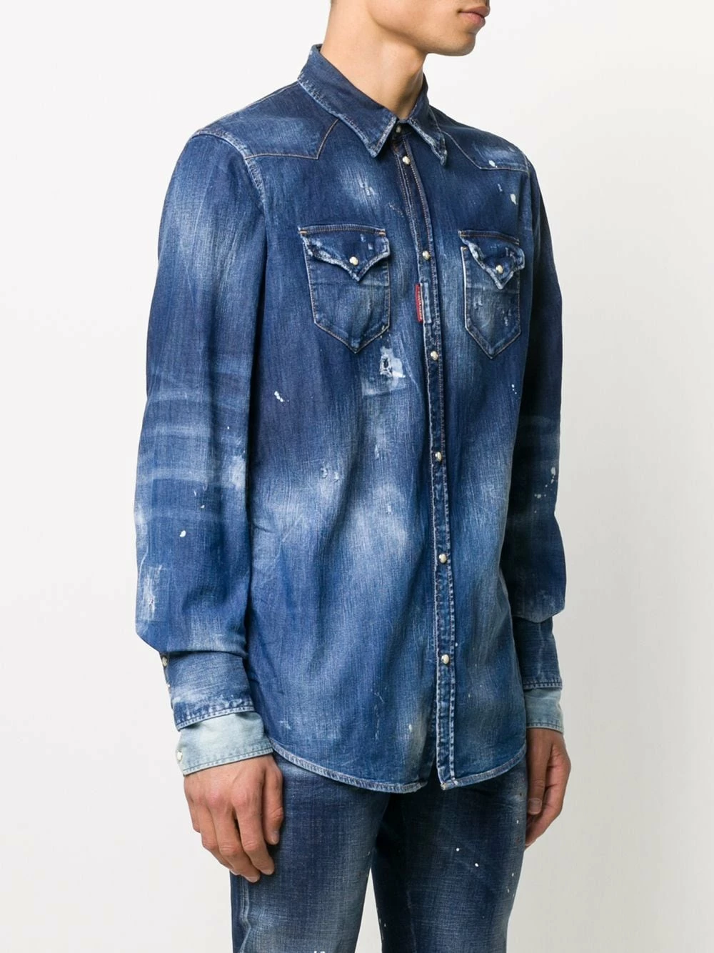 Effet usé, effet délavé, col pointu, deux poches poitrines boutonnées, manches longues, boutonnière sur le devant, ourlet incurvé.