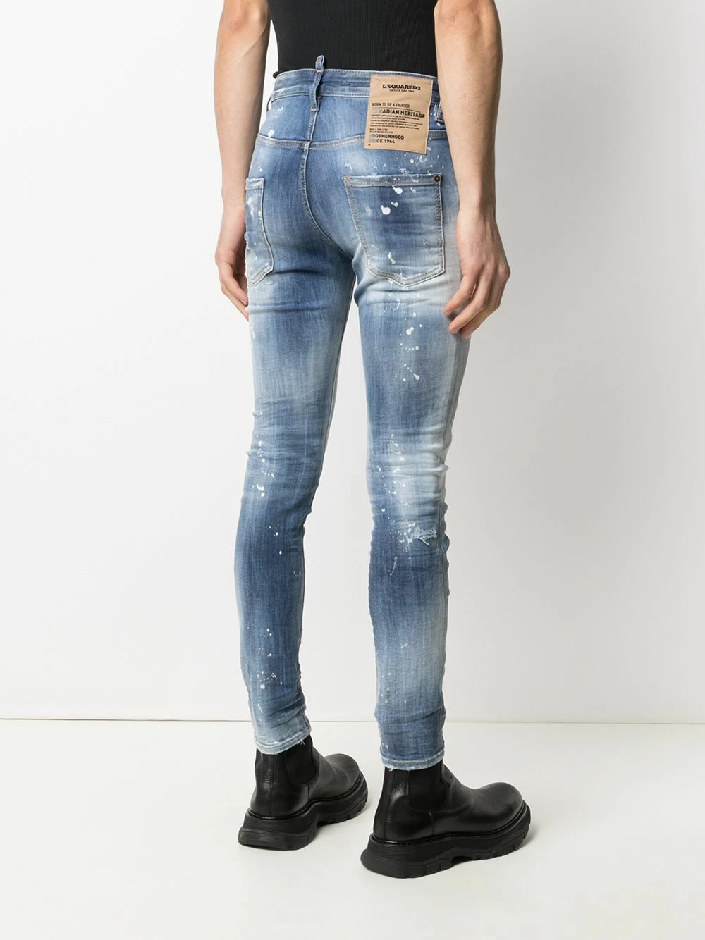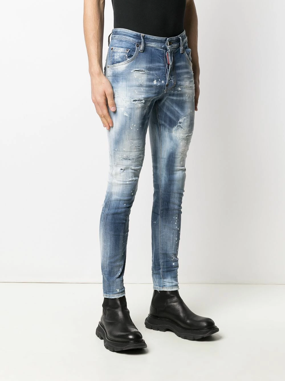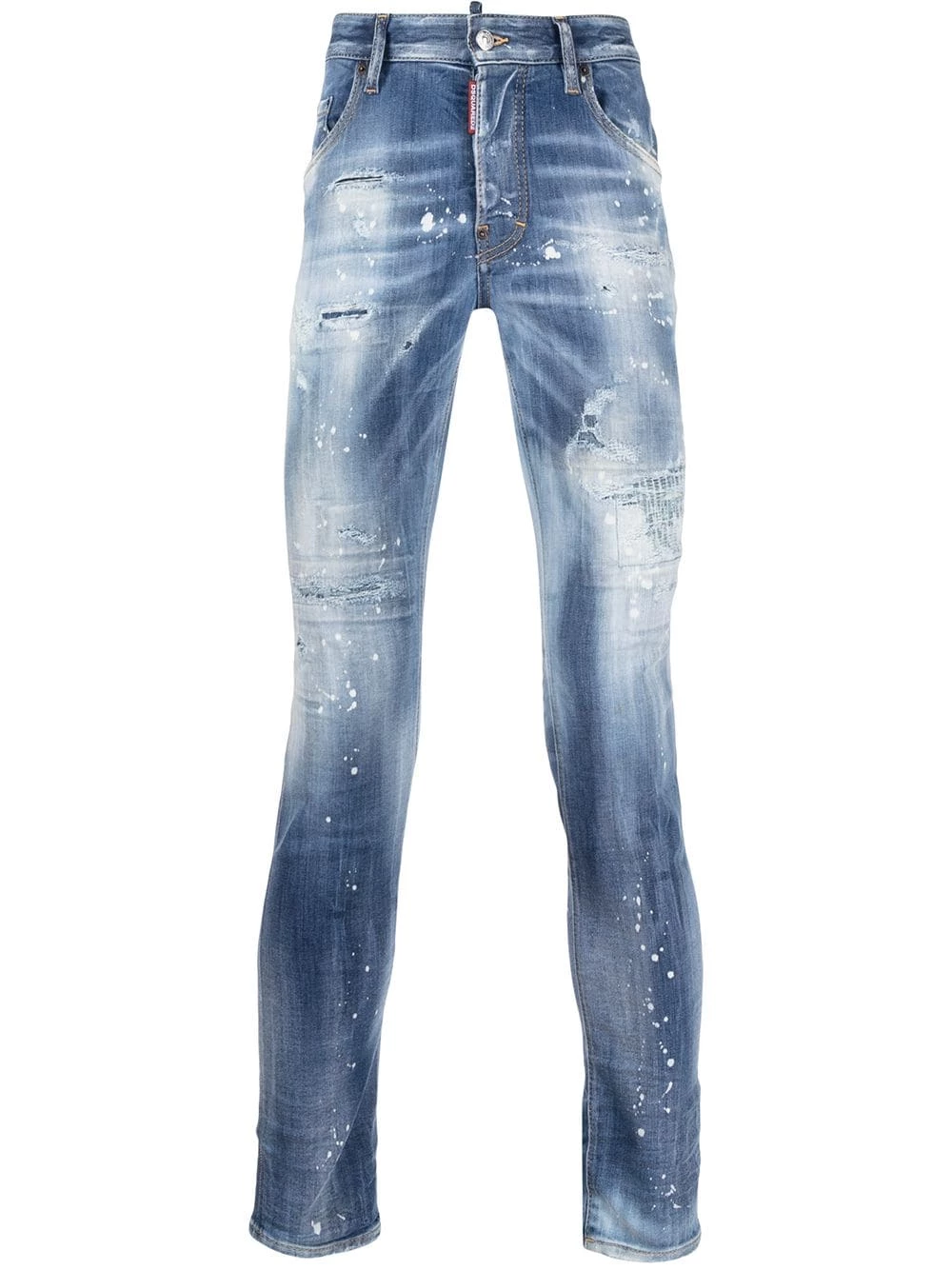 Taille haute, fermeture à zip et boutons sur le devant, 5 poches classiques, coupe skinny. Couleur : Bleu.