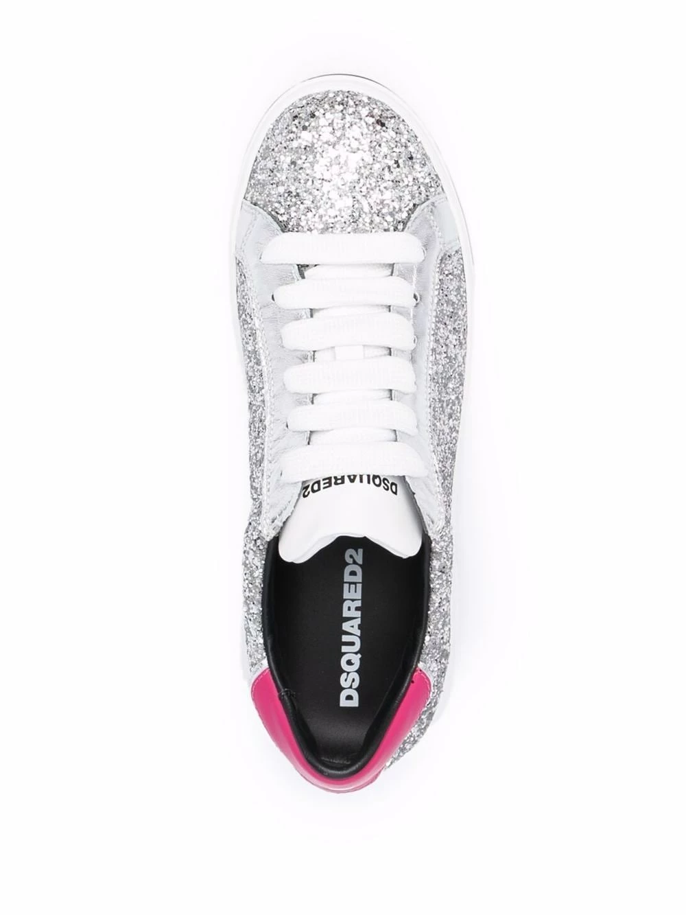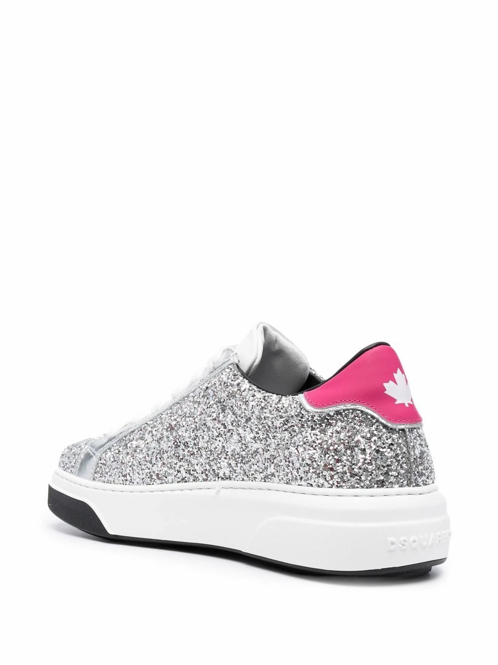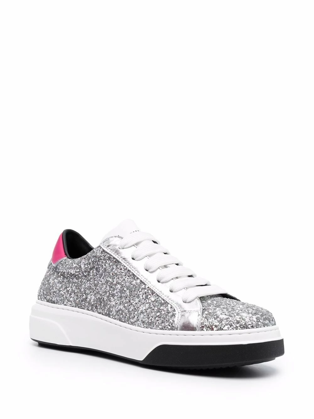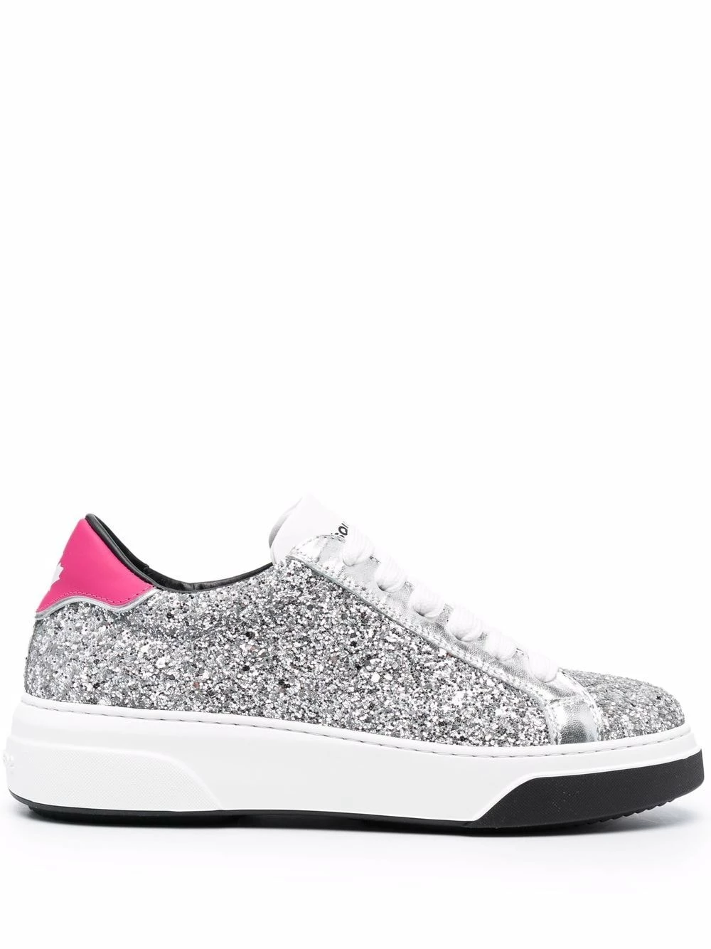 Détail pailleté, languette à logo imprimé, contrefort à logo, bout rond, fermeture à lacer sur le devant, semelle plate en caoutchouc.