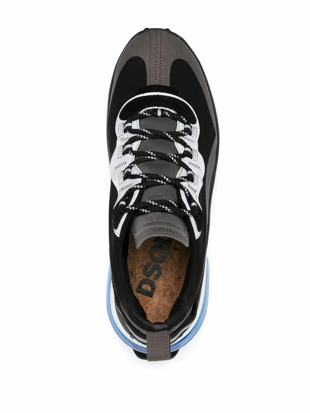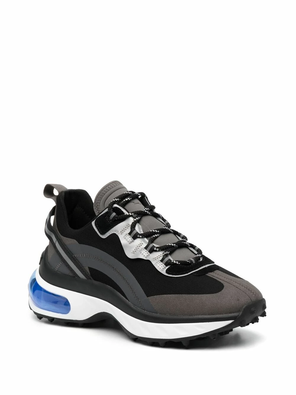 Empiècements contrastants, patch logo sur l’arrière, languette d’enfilage au talon, semelle crantée en caoutchouc, bout rond, fermeture à lacer sur le devant.