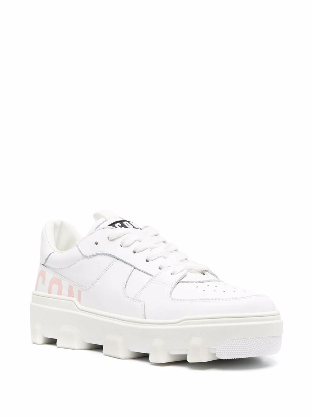 Languette à patch logo, détails de perforations, bout rond, fermeture à lacer sur le devant, semelle intérieure à logo, semelle crantée en caoutchouc. Couleur : blanc. Matière : cuir.
