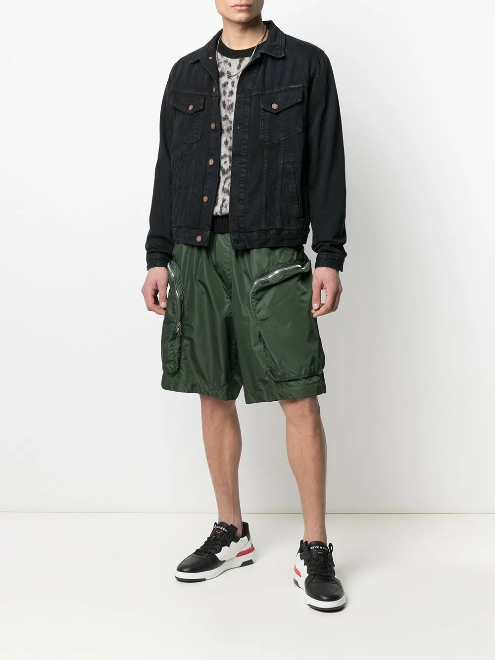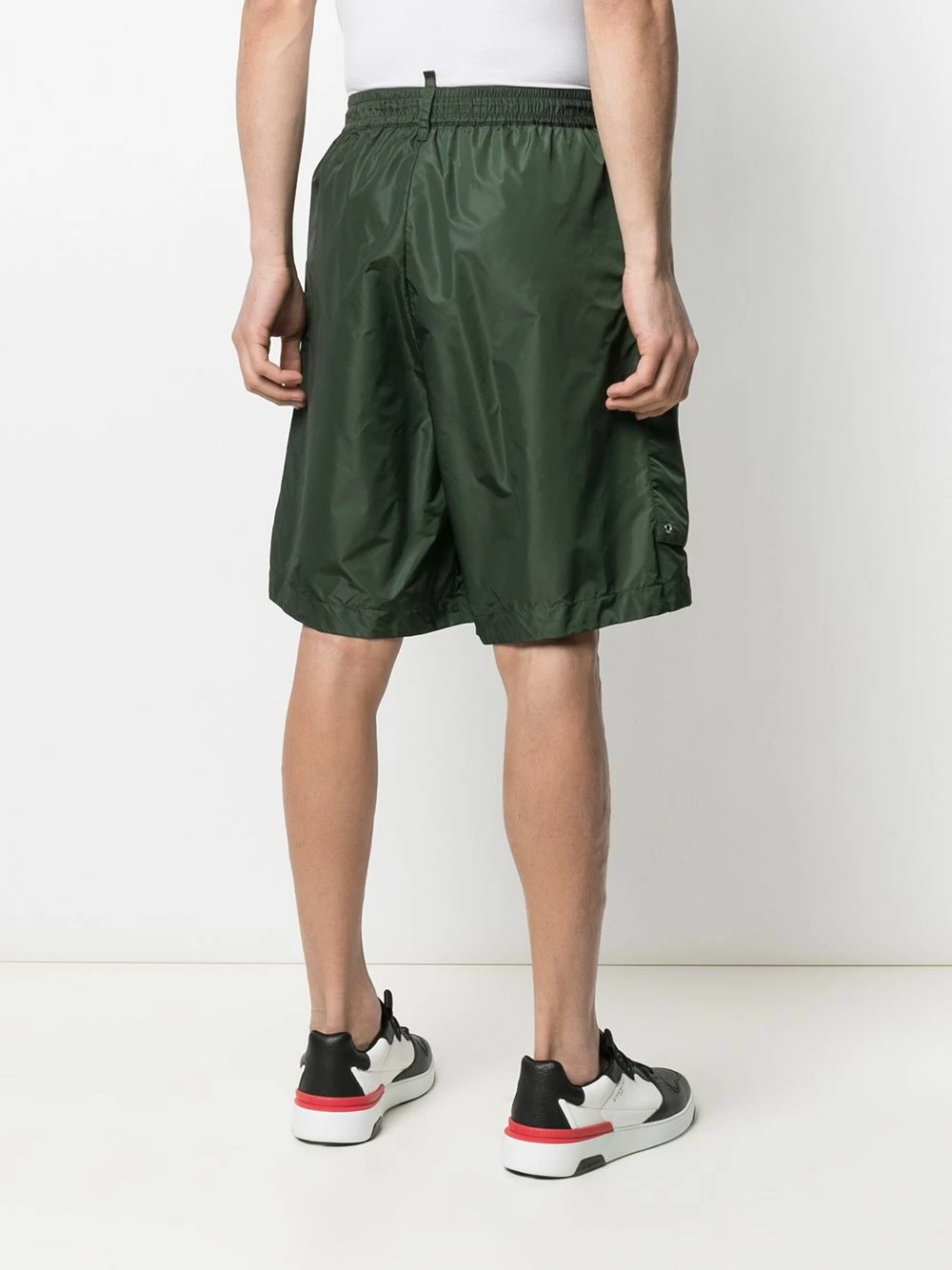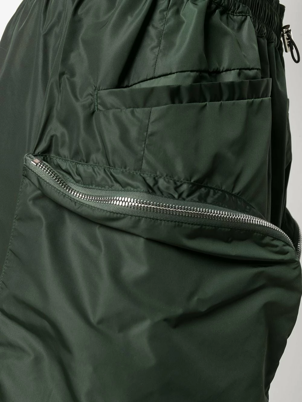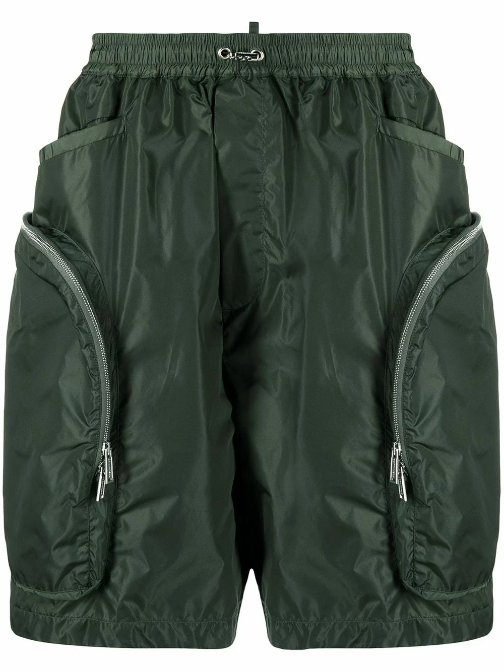 Lien de resserrage à la taille, deux poches latérales plaquées, deux poches latérales zippées, hauteur genou. Couleur : vert.