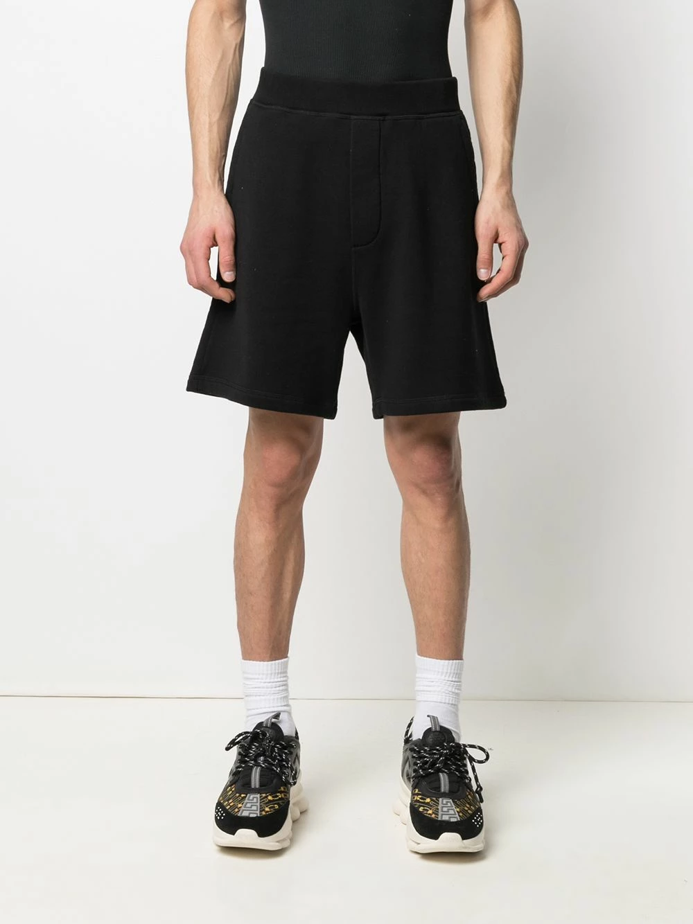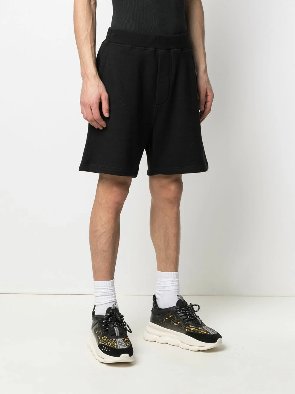 Logo imprimé à l’arrière, ceinture élastique, coupe ample, hauteur genou, deux poches latérales passepoilées. Couleur : Noir. Matière : coton.