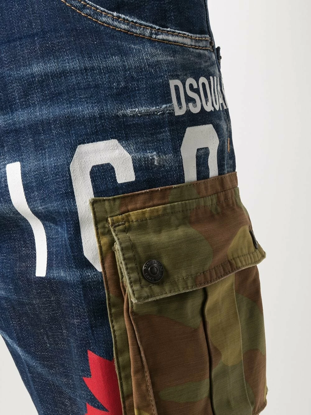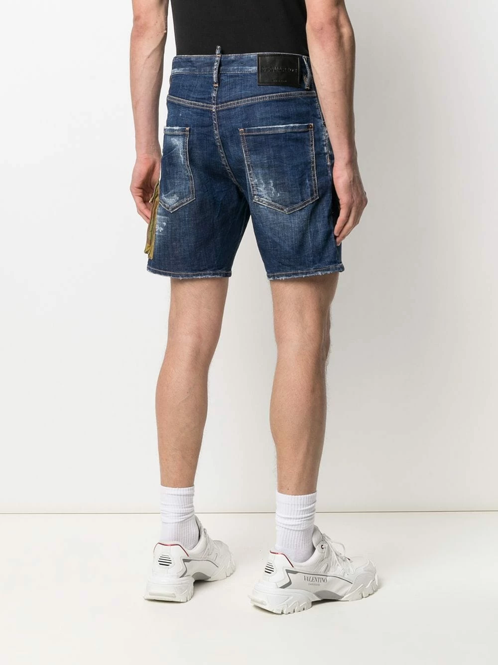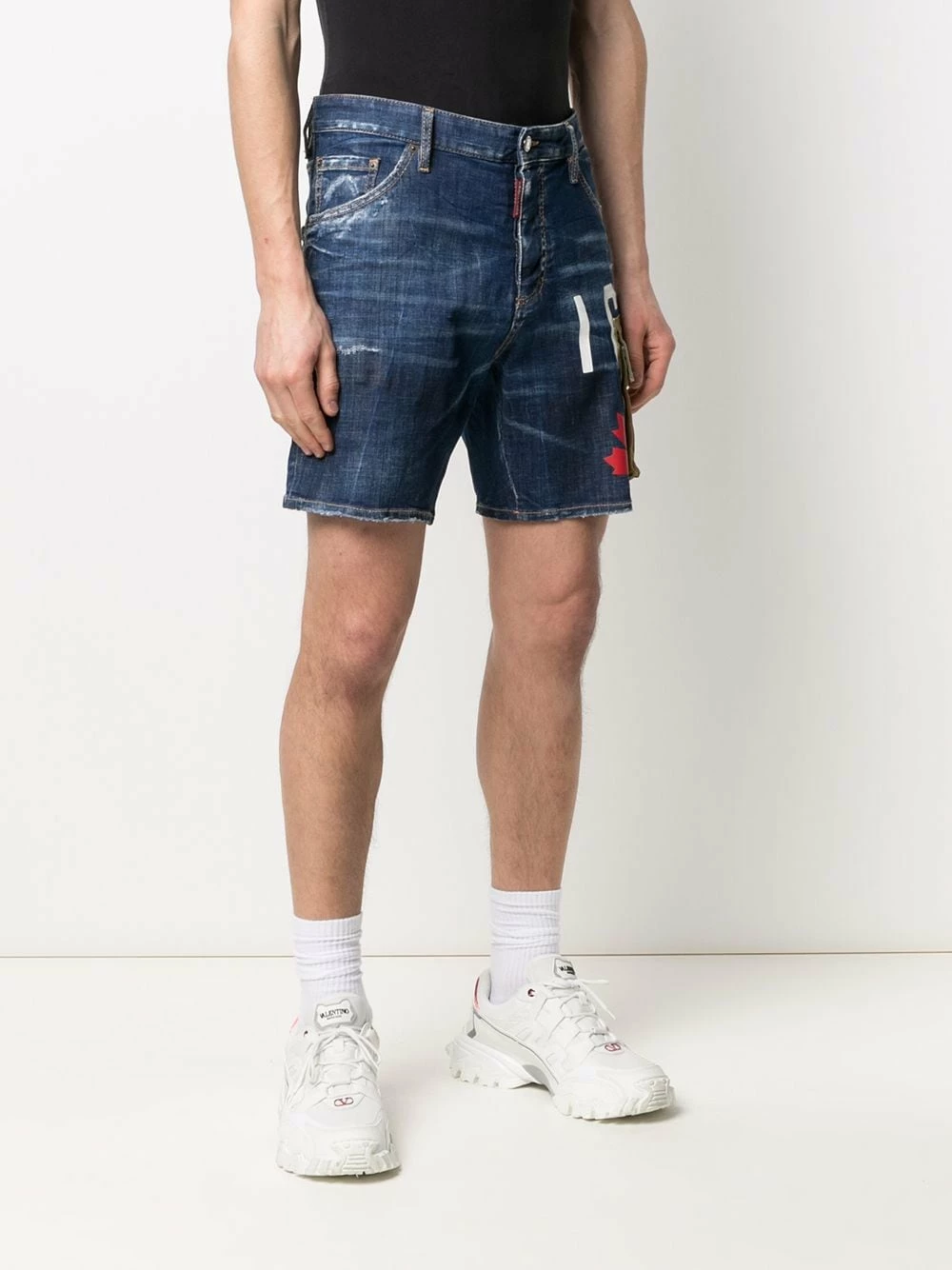 Taille haute, fermeture à zip et boutons sur le devant, 5 poches classiques, coupe droite, hauteur genou, logo imprimé sur la cuisse. Couleur : Bleu. Matière : coton.