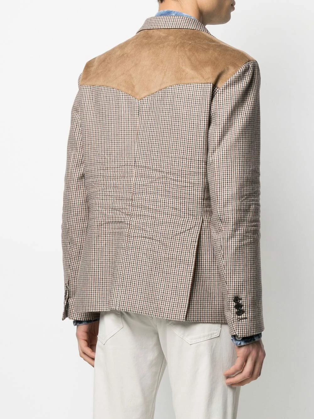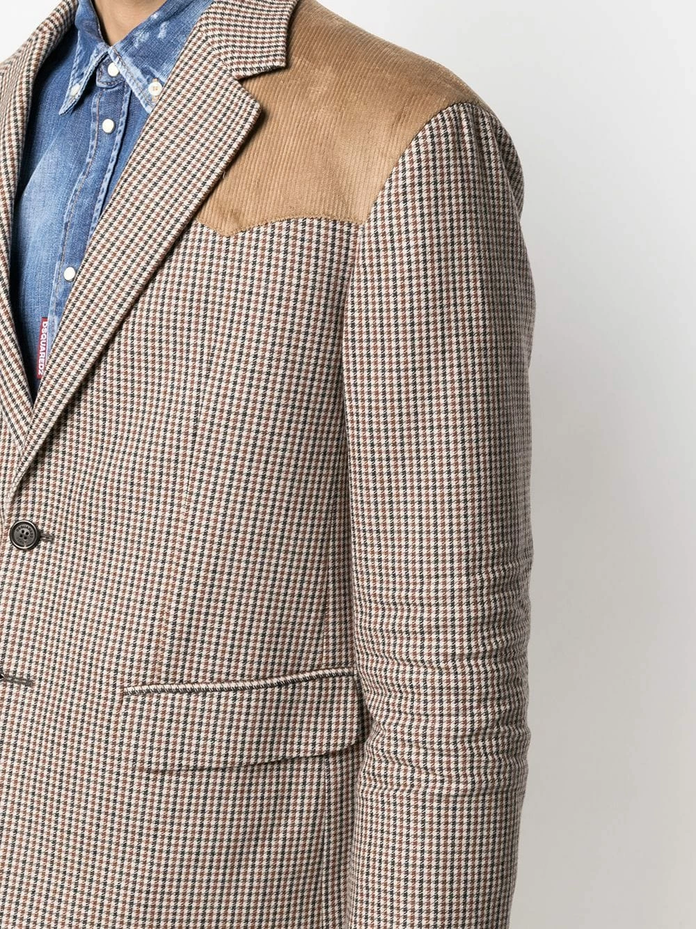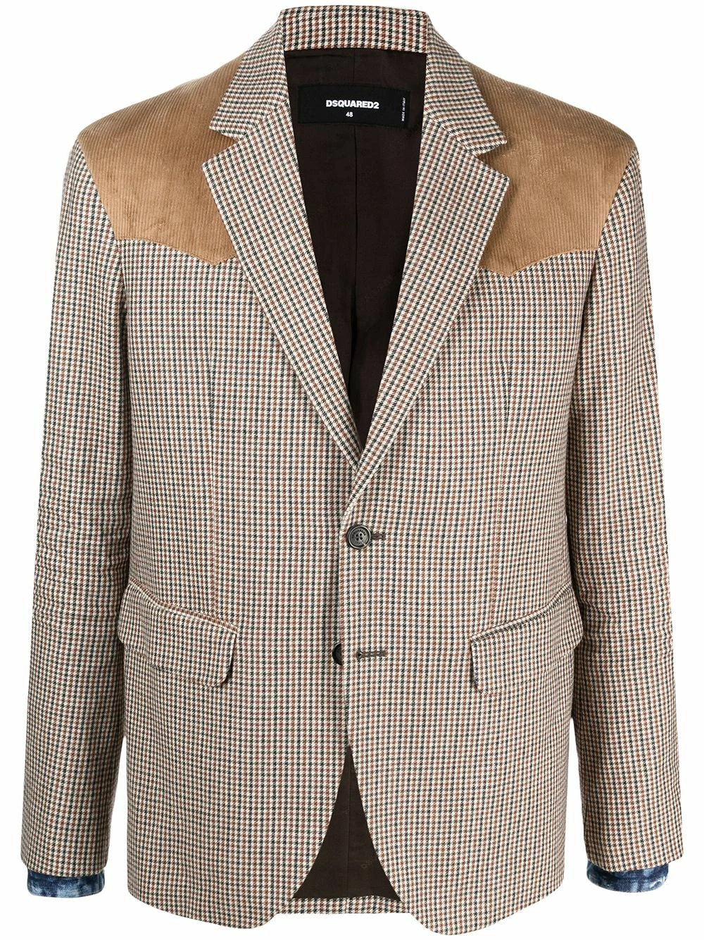 Imprimé à carreaux, détails en velours côtelé, revers crantés, manches longues, poignets boutonnés, boutonnière sur le devant, deux poches latérales à rabat.