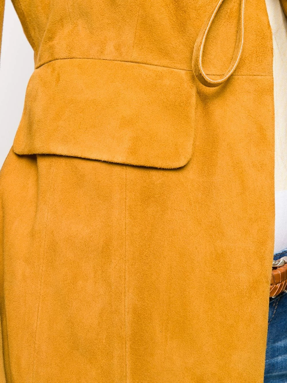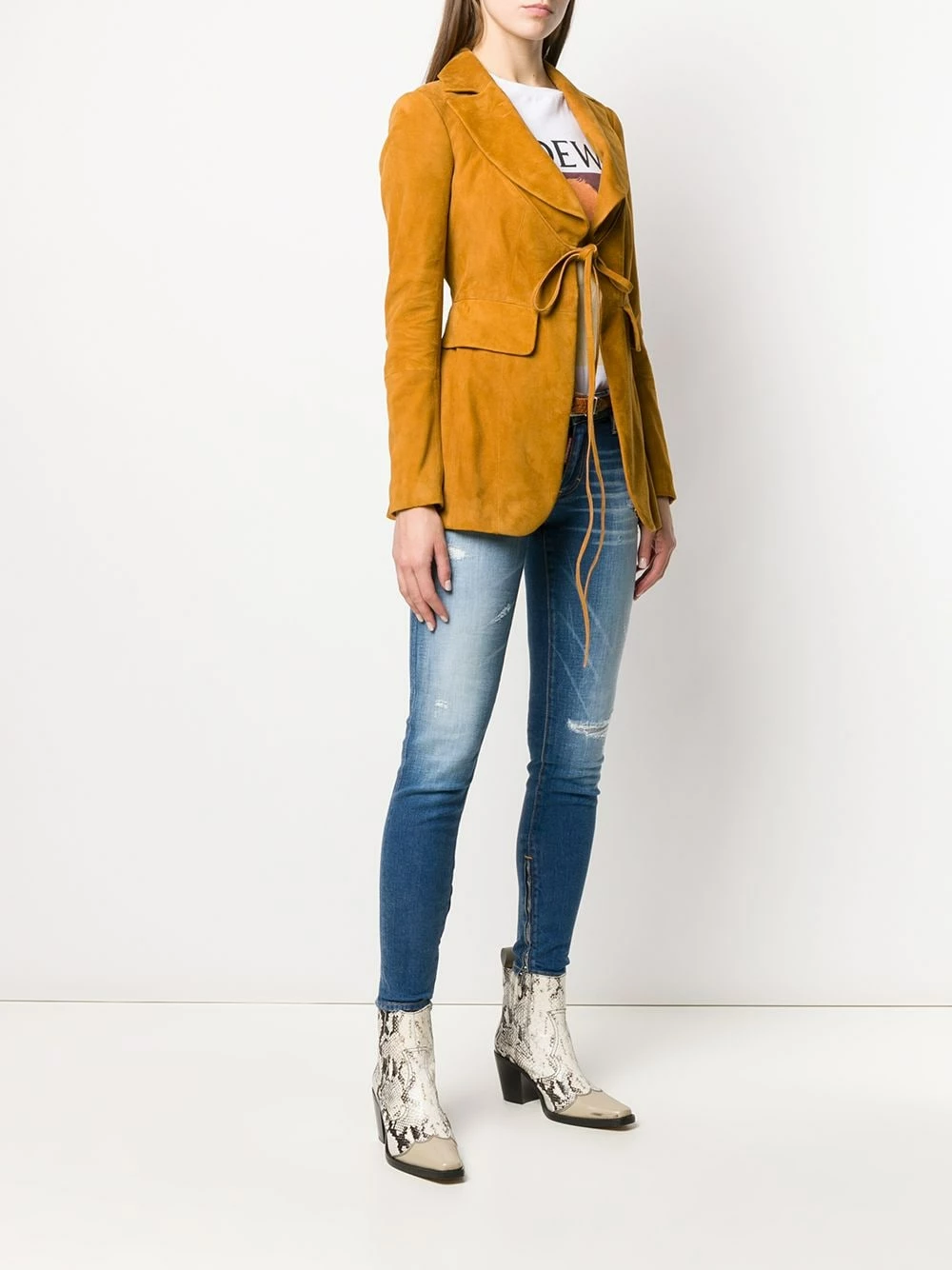 Blazer à ceinture nouée en peau de chèvre Dsquared2 avec revers crantés, poches devant à rabat, fermeture à nouer, manches longues, détails de plis arrière et doublure imprimée. Couleur : marron.