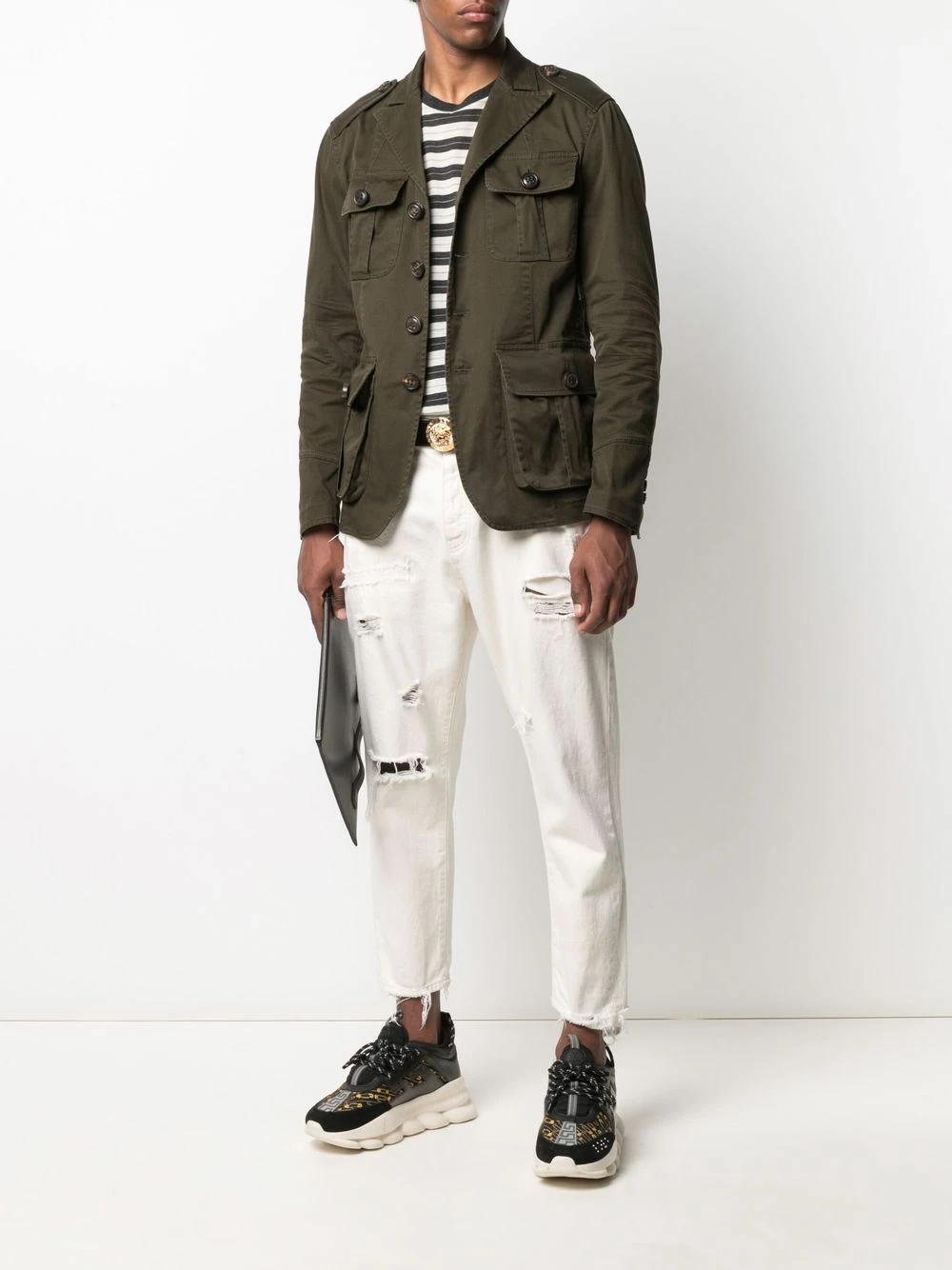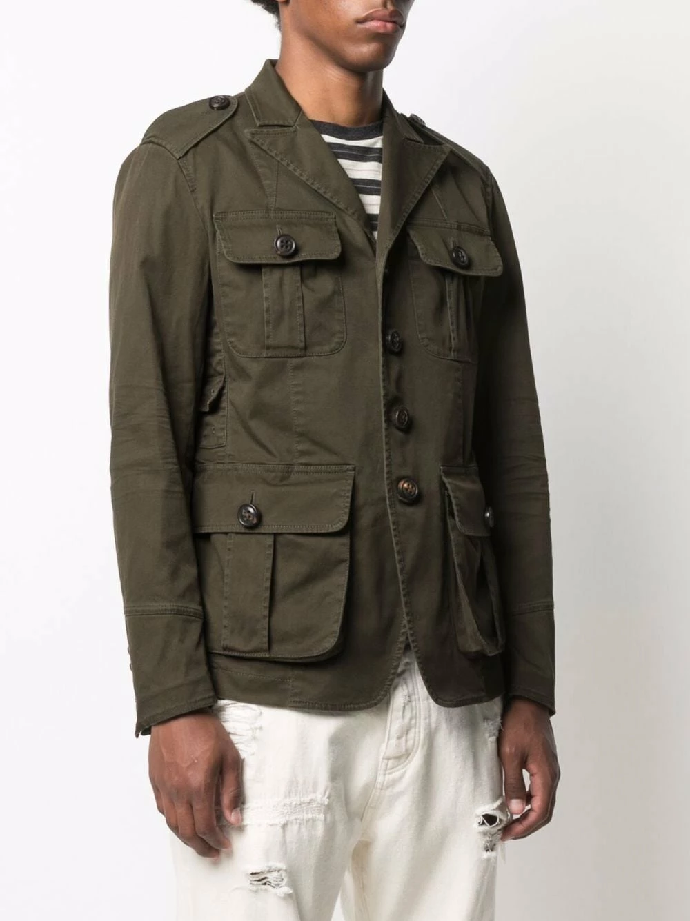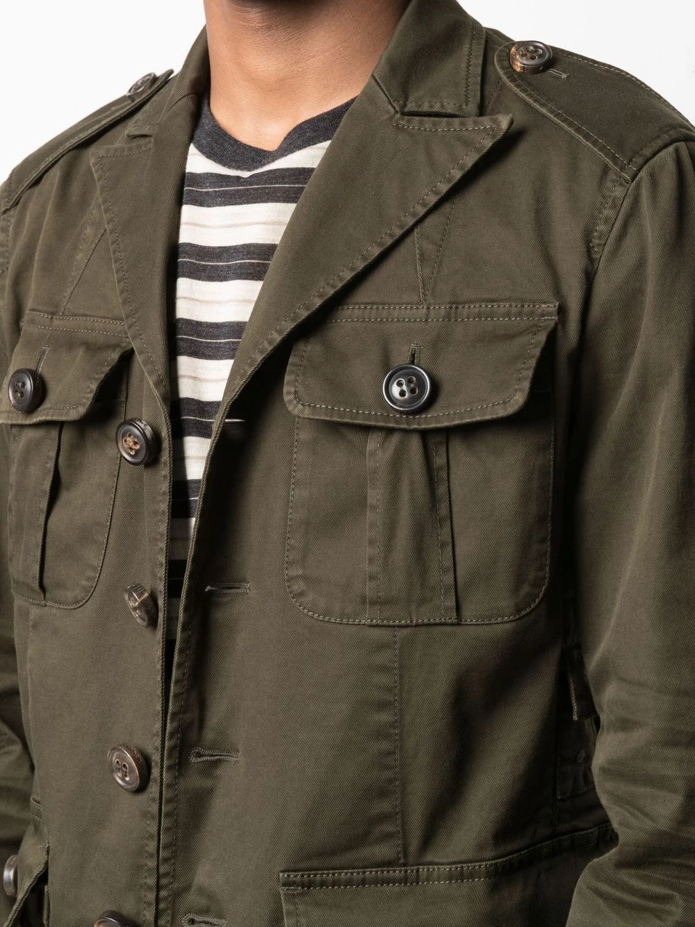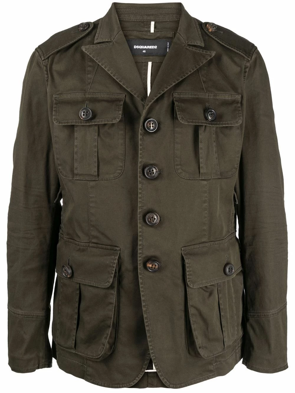 Épaulettes, revers crantés, boutonnière sur le devant, quatre poches plaquées devant, double fente arrière, manches à poignets boutonnés. Couleur : vert. Matière : coton mélangé.