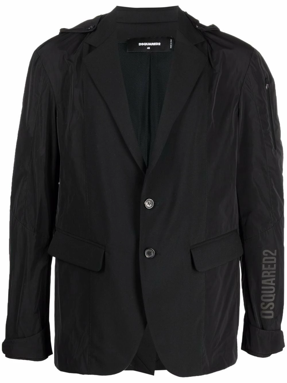Capuche classique, revers crantés, boutonnière sur le devant, manches longues, fente à l’arrière, ourlet droit.