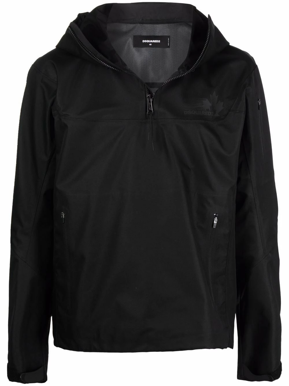 Logo imprimé à la poitrine, capuche classique, manches longues, fermeture zippée devant, deux poches latérales zippées, ourlet droit. Couleur : noir.