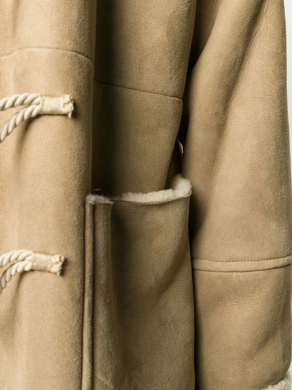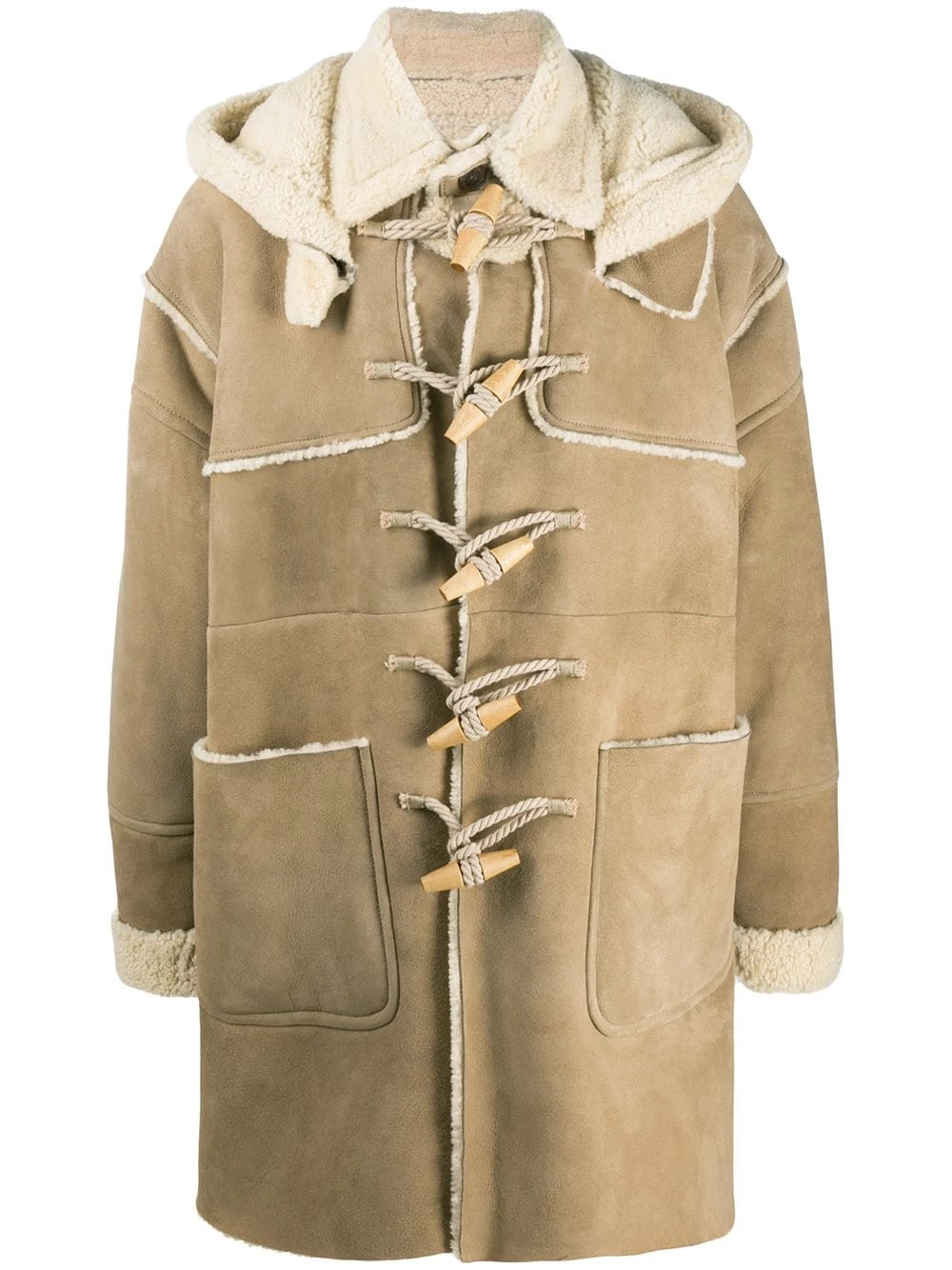 Capuche classique, doublure en mouton retourné, boutonnière sur le devant, manches longues, deux poches plaquées avant, fente arrière, coupe mi-longue.