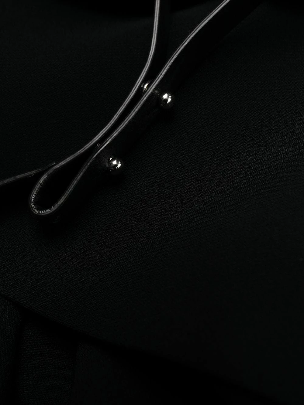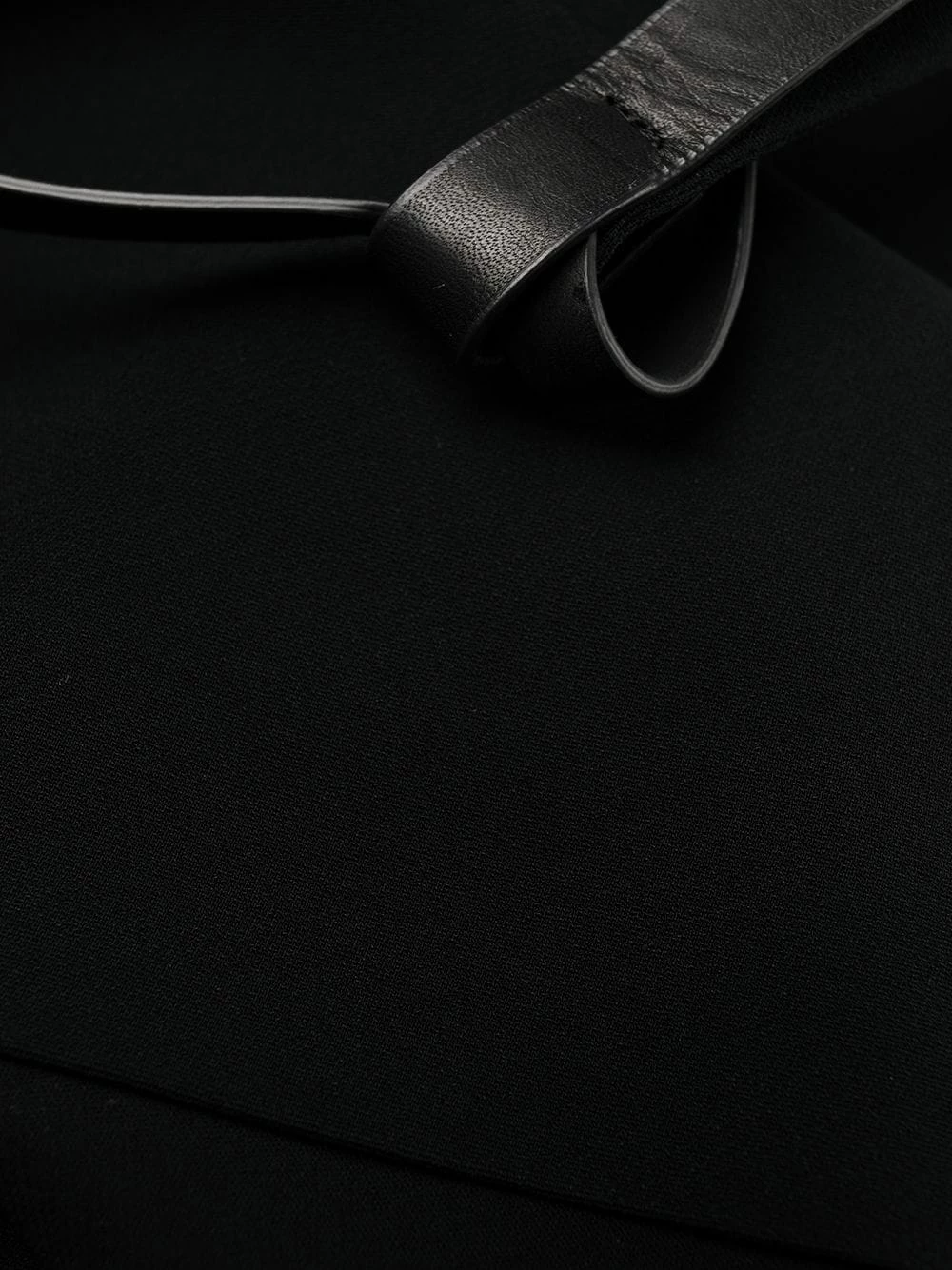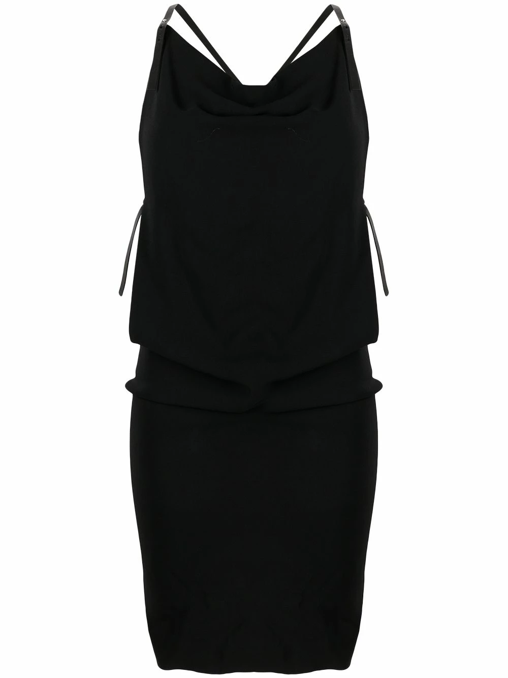 Fines bretelles, col bénitier, détails de brides, design à empiècements, détails drapés. Couleur : Noir.