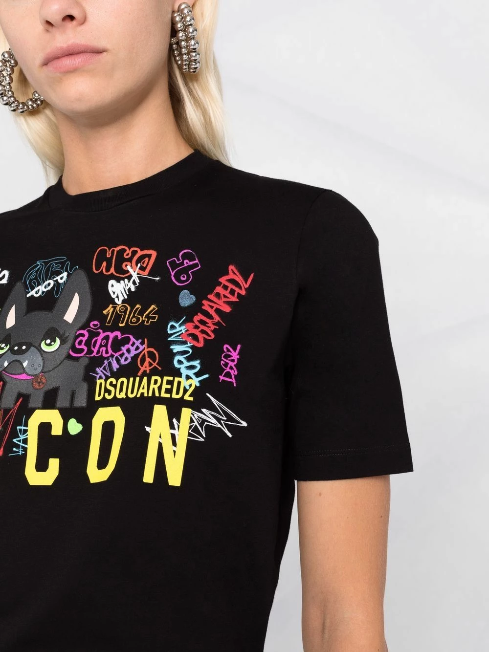 Imprimé graphique, imprimé monogrammé, encolure ras du cou, manches courtes, ourlet droit. Matière : coton.