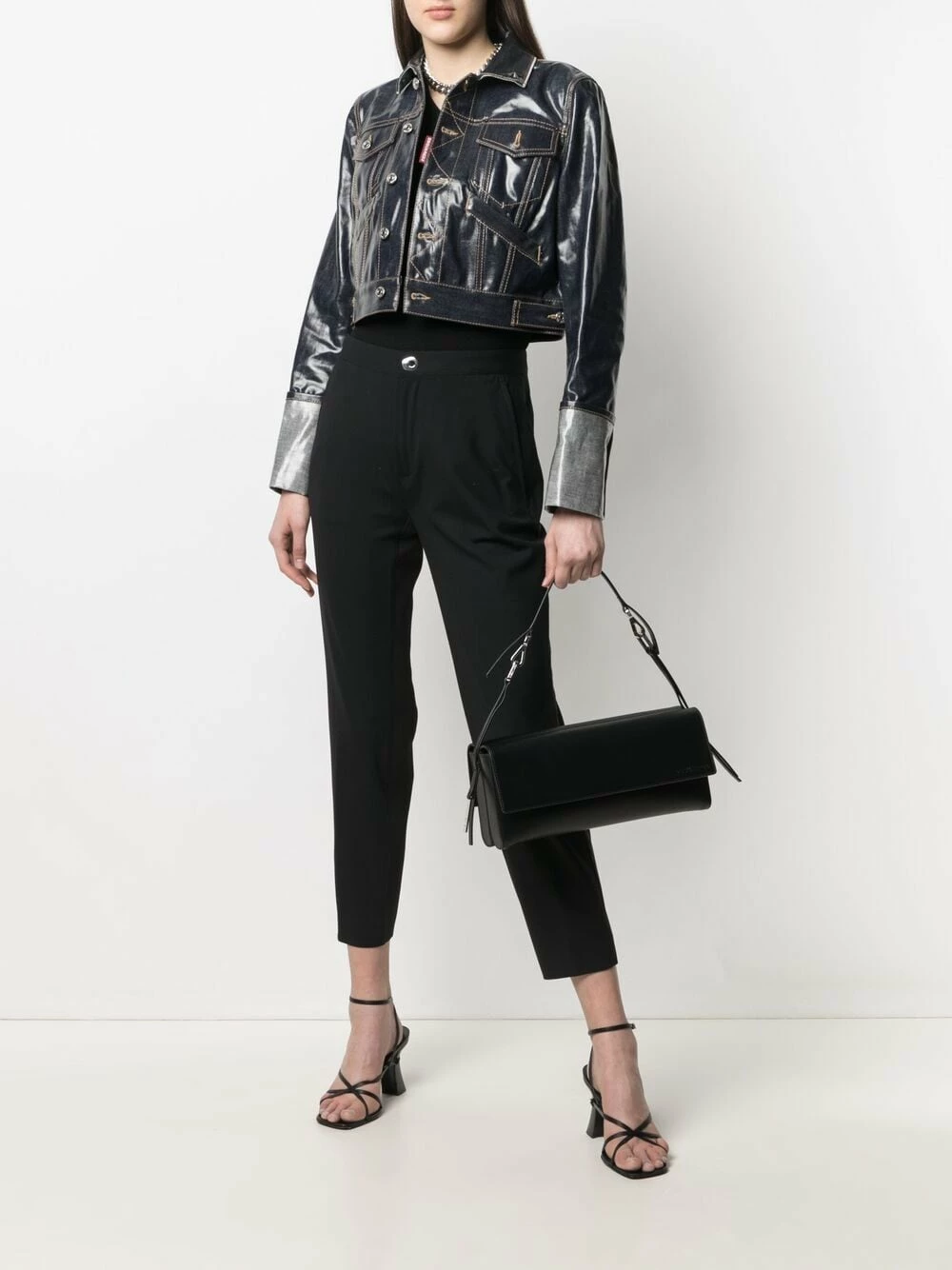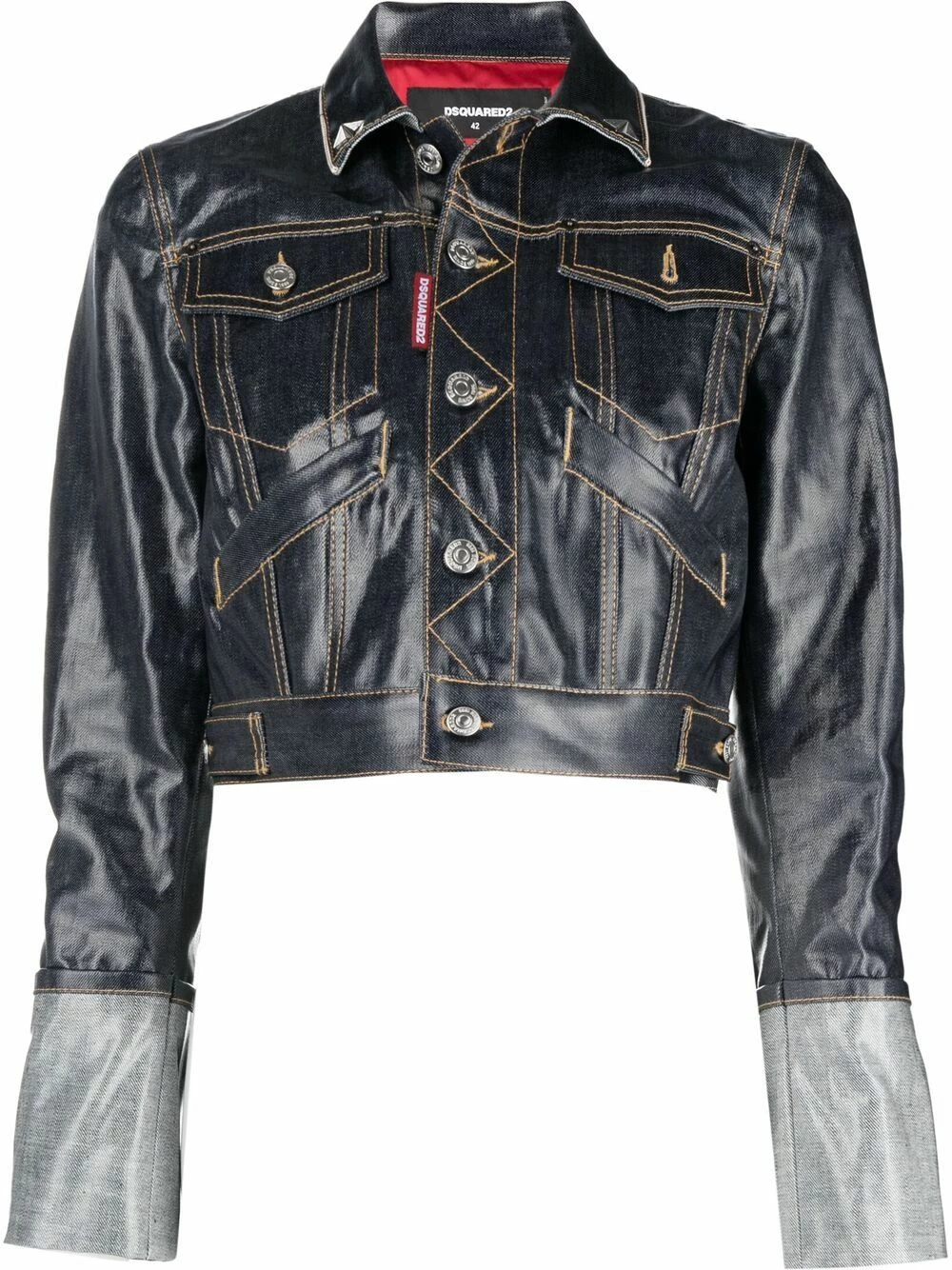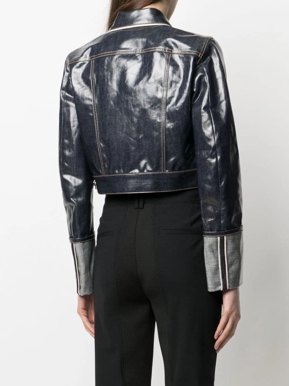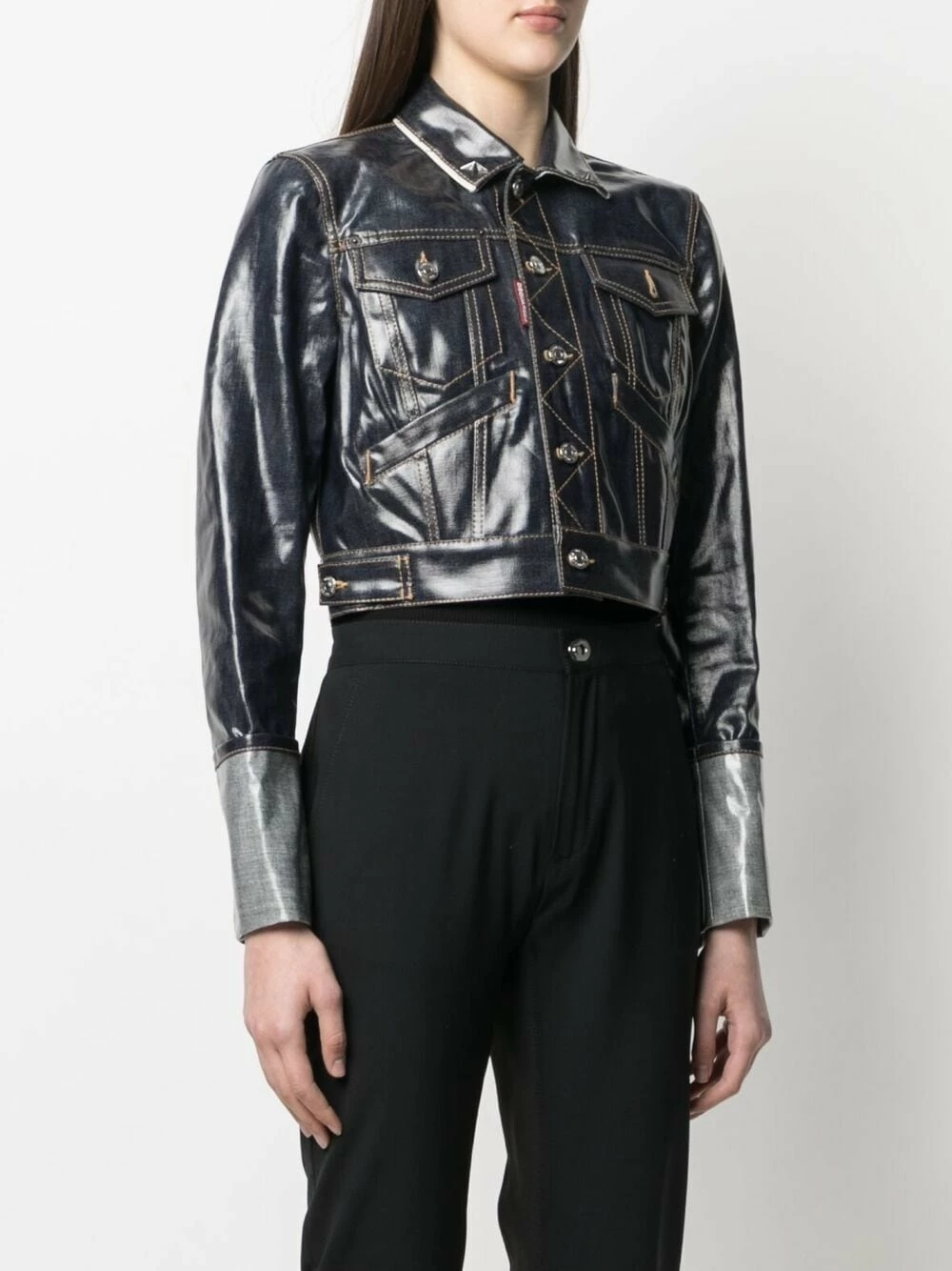 Coutures contrastantes, fini verni, coupe courte, boutonnière sur le devant, col pointu, manches longues. Matière : coton.