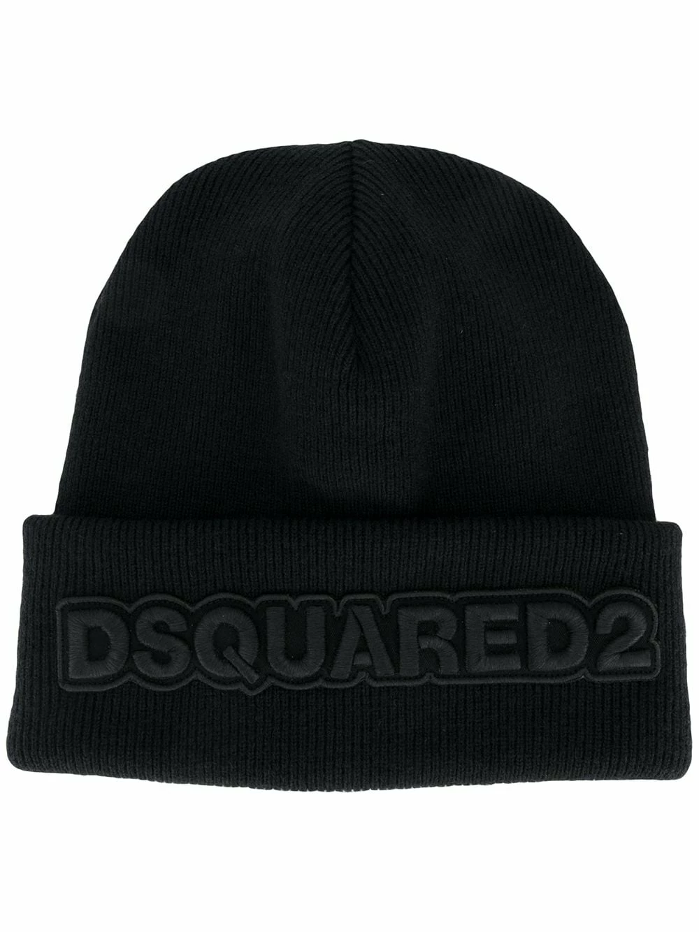 Bonnet à logo brodé en laine Dsquared2 avec ourlet à revers et a chunky knit. Couleur : noir.