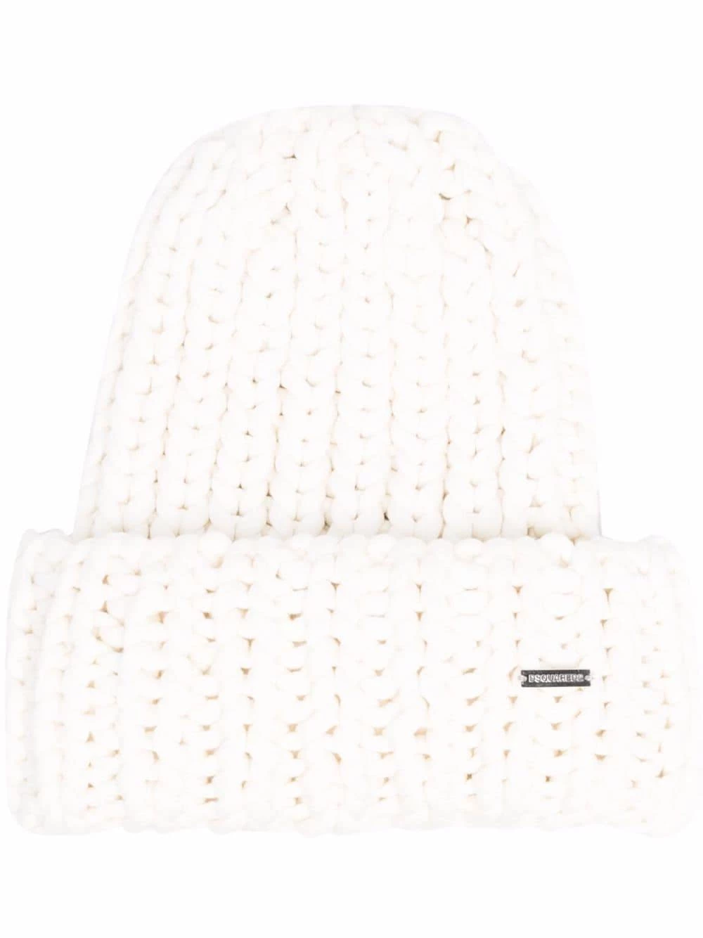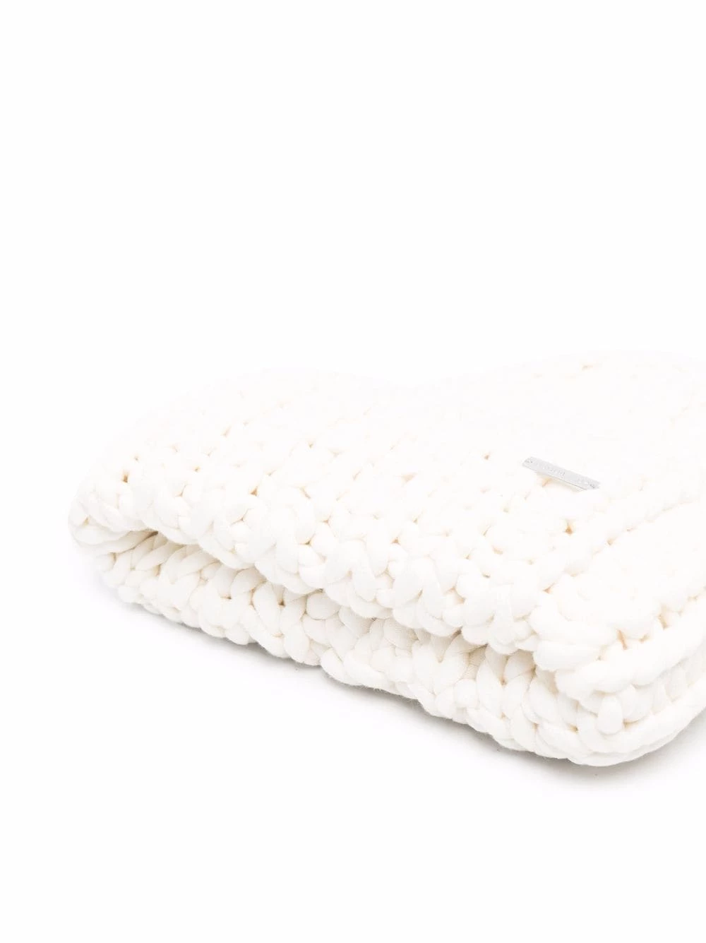 Maille épaisse, plaque logo argentée, ourlet retroussé. Couleur : blanc.