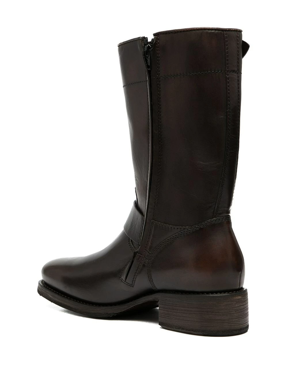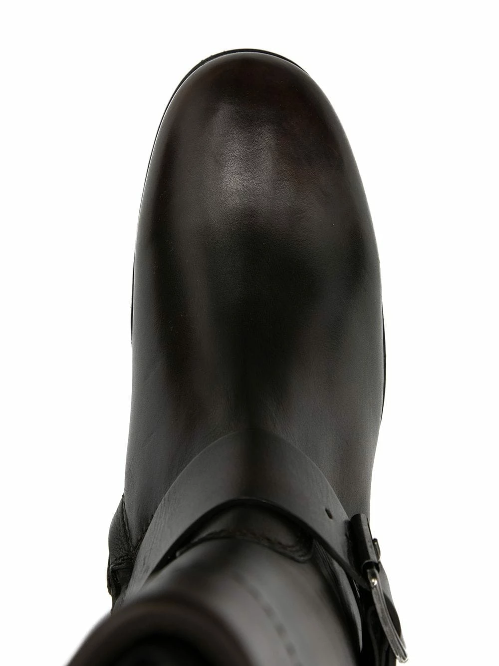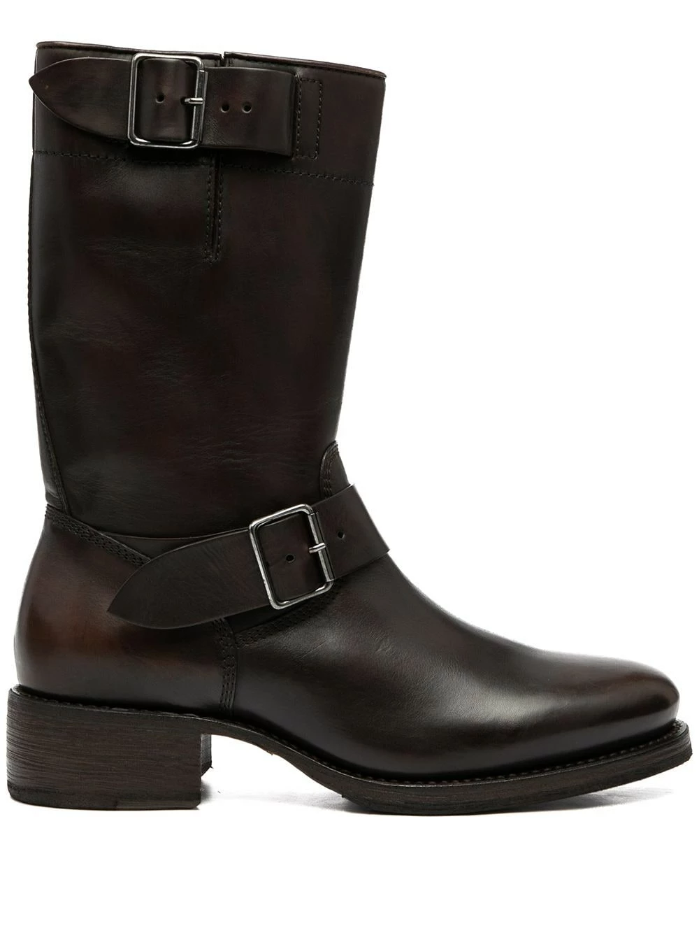 Bout rond, fermeture à double boucles, fermeture zippée sur les côtés, semelle plate en caoutchouc, petit talon épais. Matière : cuir.