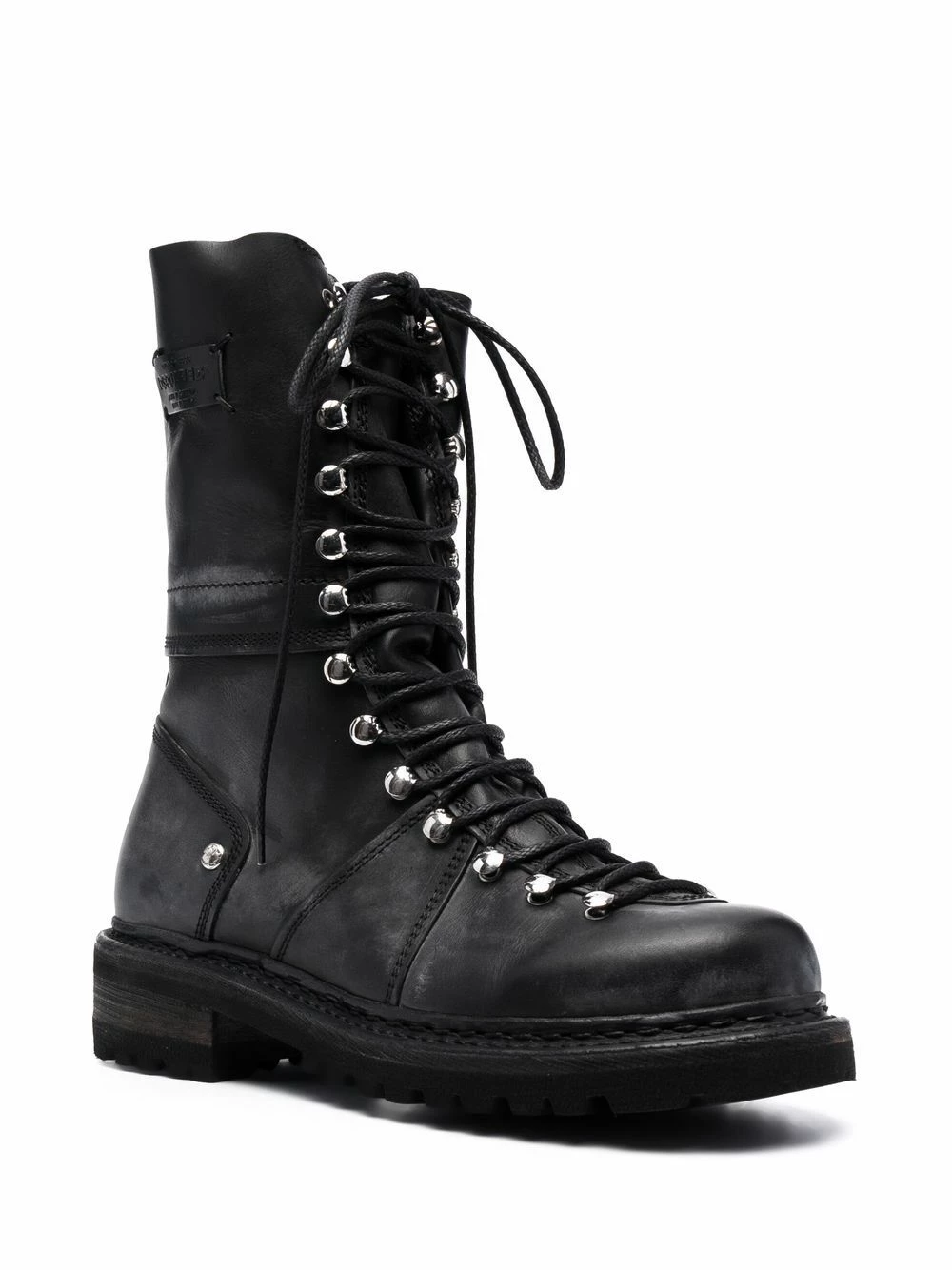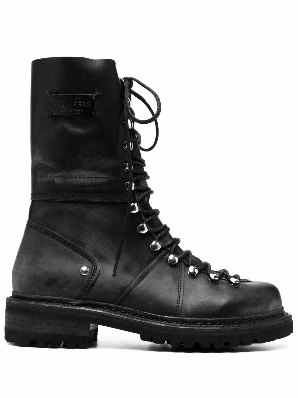 Noir, cuir, cuir de veau, patch logo sur le côté, bout rond, fermeture à lacer sur le devant, semelle intérieure à logo, semelle crantée en caoutchouc.