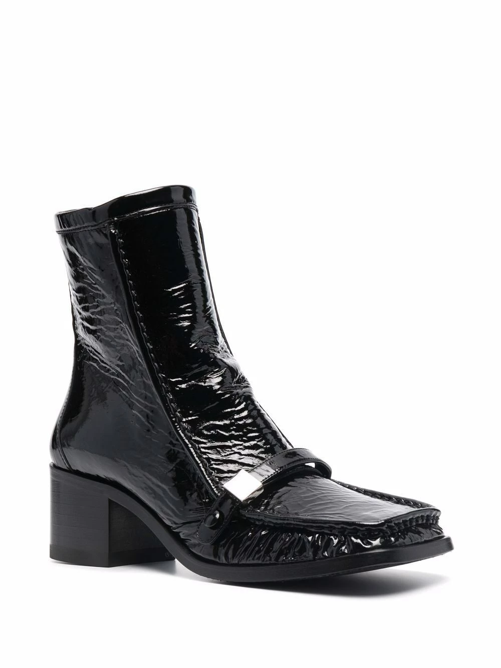 Bout carré, plaque logo, fermeture zippée sur le côté, hauteur cheville, semelle plate, talon mi-haut épais. Couleur : noir. Matière : cuir.