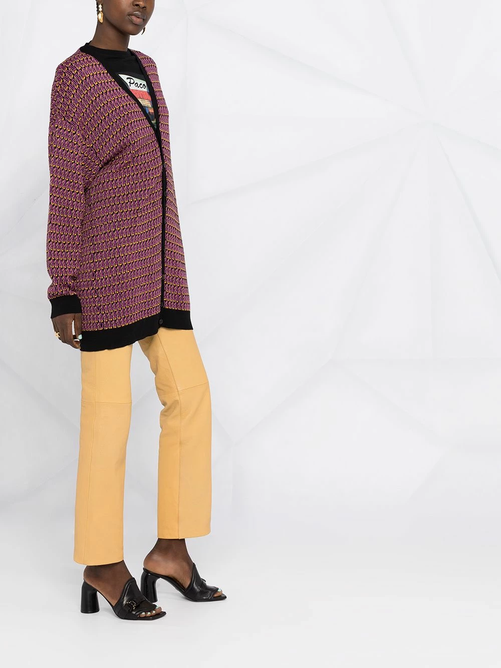 Motif géométrique, col v, boutonnière sur le devant, manches longues, ourlet droit. Couleur : Violet.