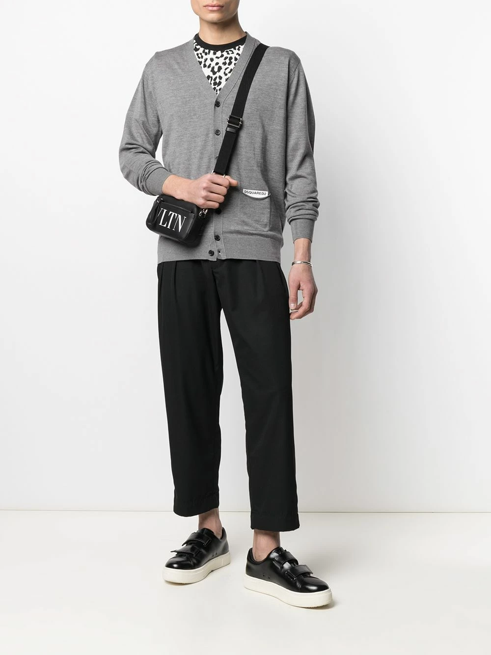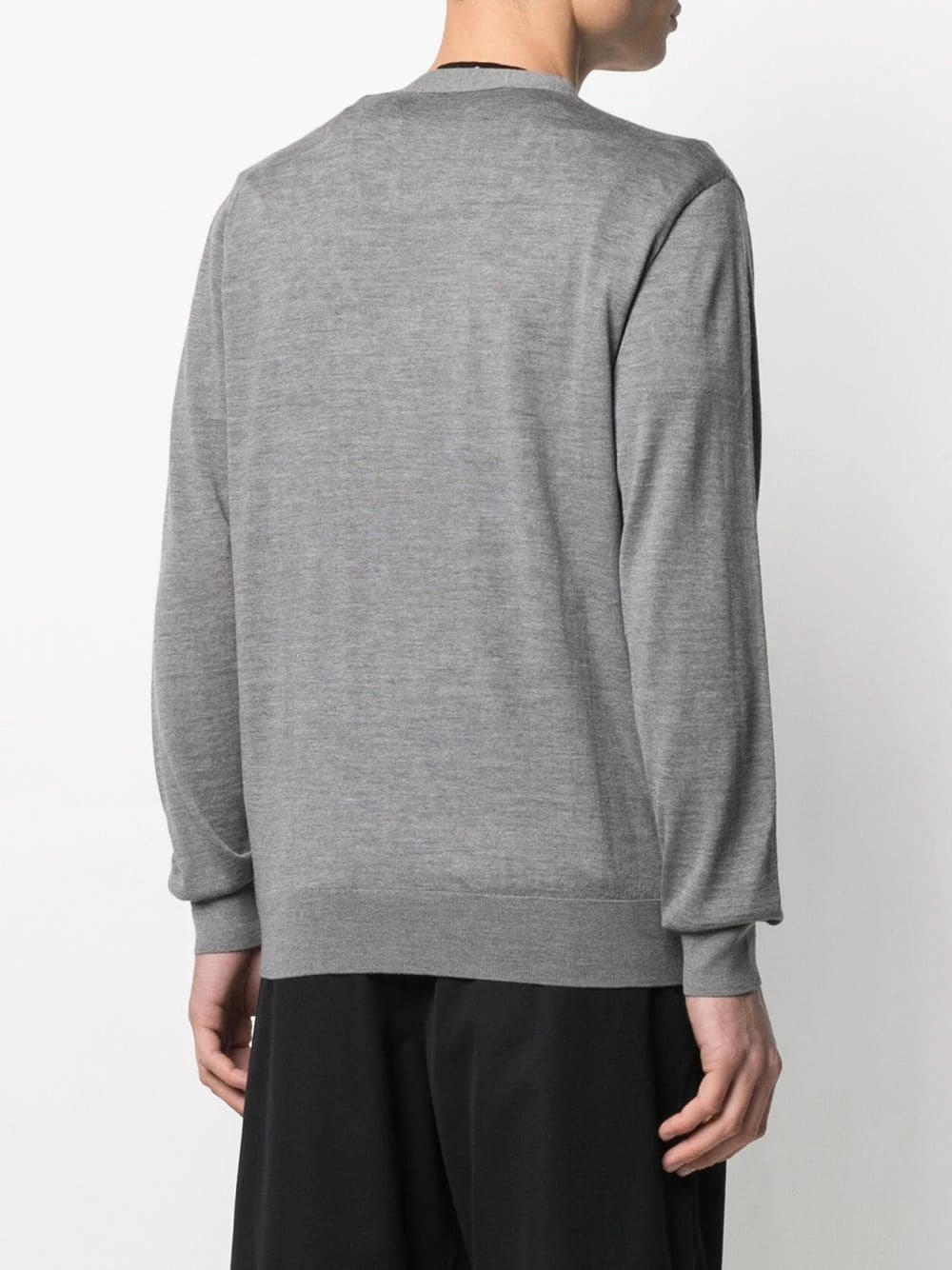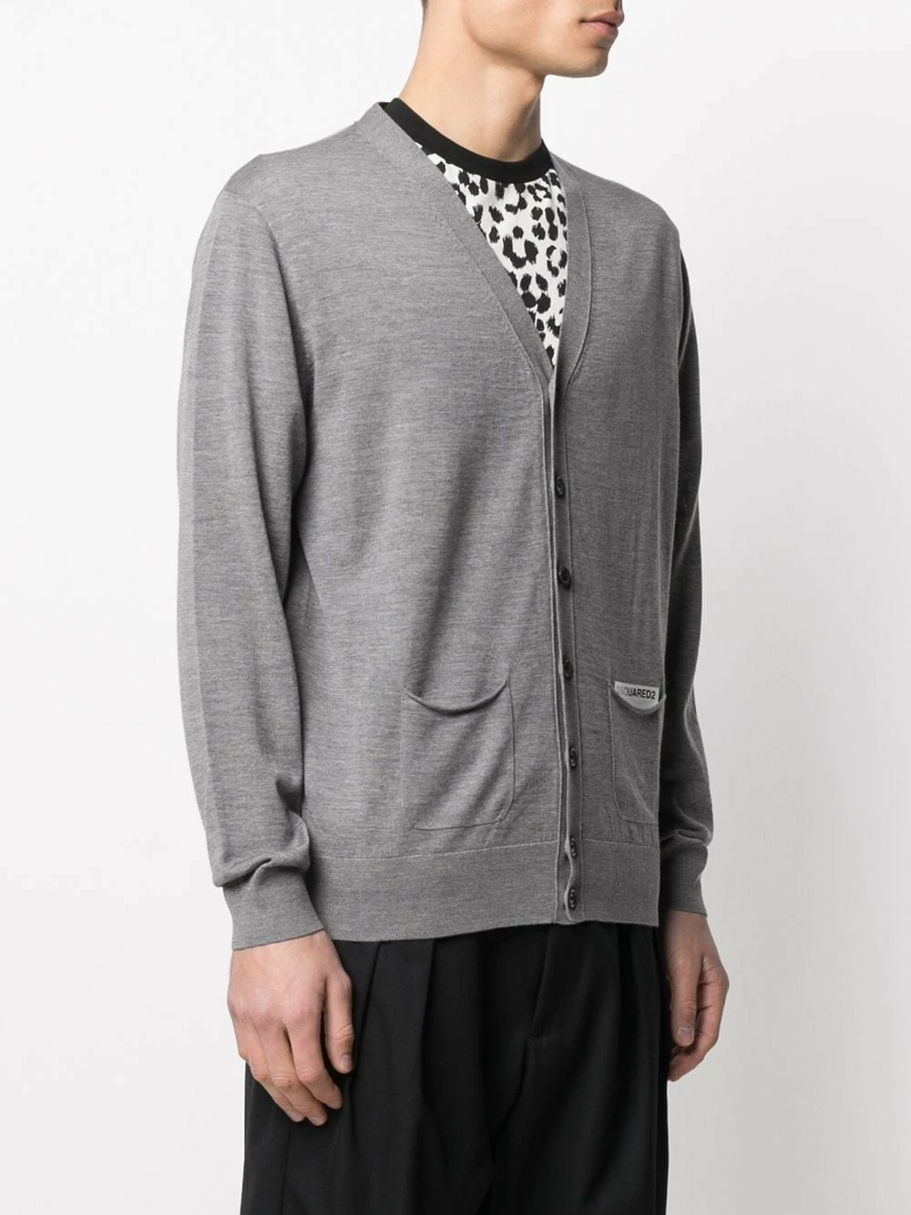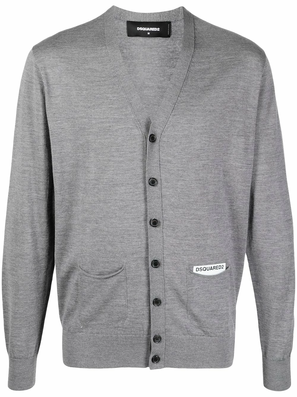 Patch logo sur le devant, col v, manches longues, boutonnière sur le devant, deux poches plaquées avant, poignets nervurés, ourlet nervuré. Couleur : gris. Matière : laine.