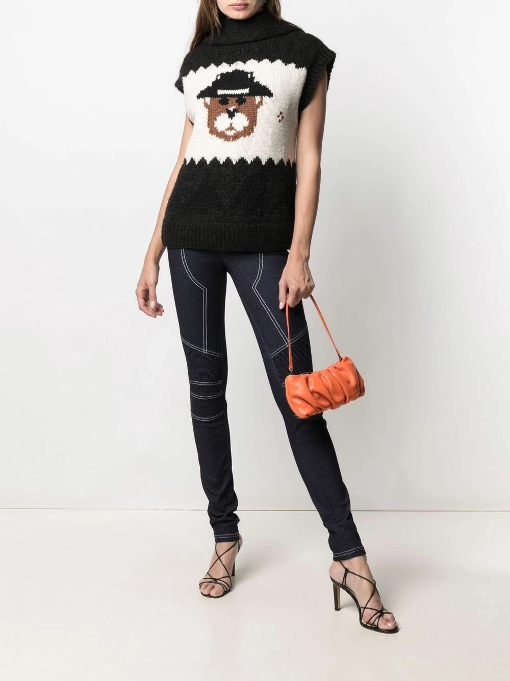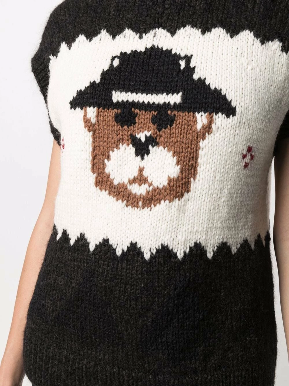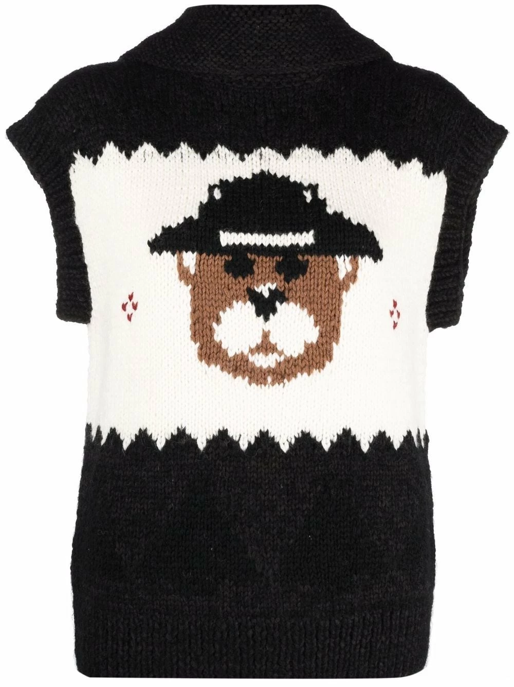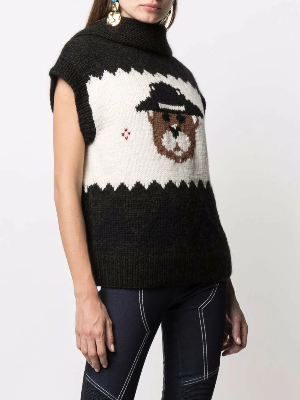 Maille intarsia, col italien, boutonnière sur le devant, design sans manches.
