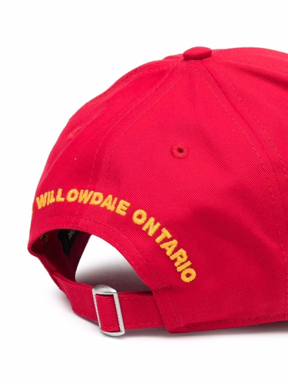 Broderies, bord large incurvé, effet usé, taille ajustable. Couleur : rouge. Matière : coton.