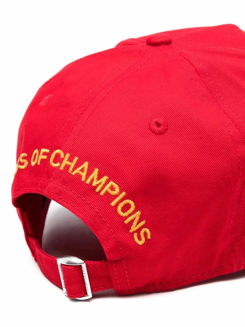Broderies, design à six empiècements, œillets de ventilation, bord incurvé, fermeture à boucle à l’arrière. Couleur : rouge. Matière : coton.