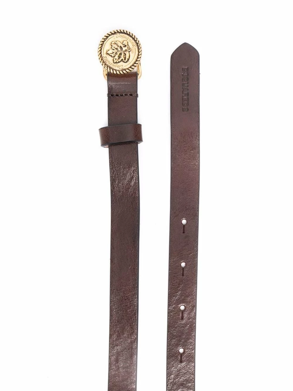 Texture grainée, imprimé feuille d’érable, détail embossé, logo gravé, fermeture à boucle dorée, logo embossé, taille ajustable. Couleur : marron. Matière : cuir de veau.