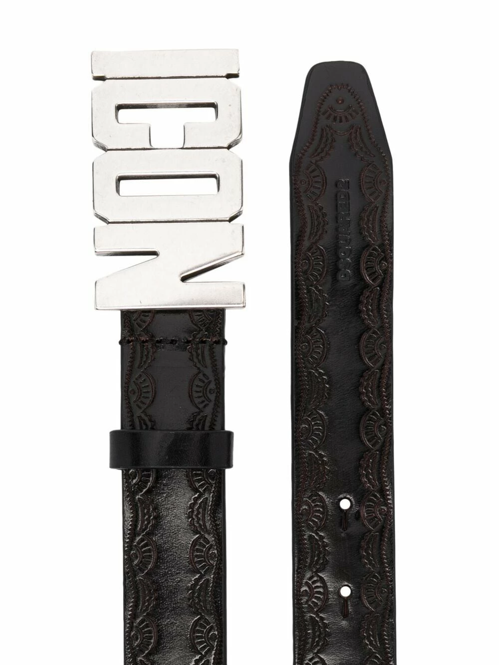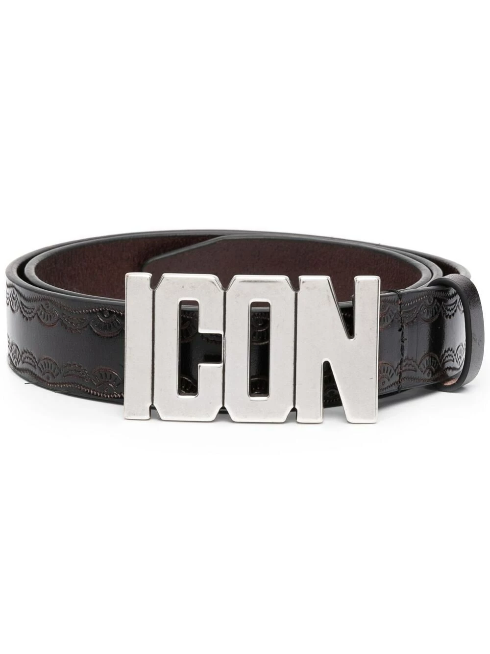 Détail embossé, plaque logo, ornements argentés, fermeture à boucles, taille ajustable. Couleur : noir. Matière : cuir.