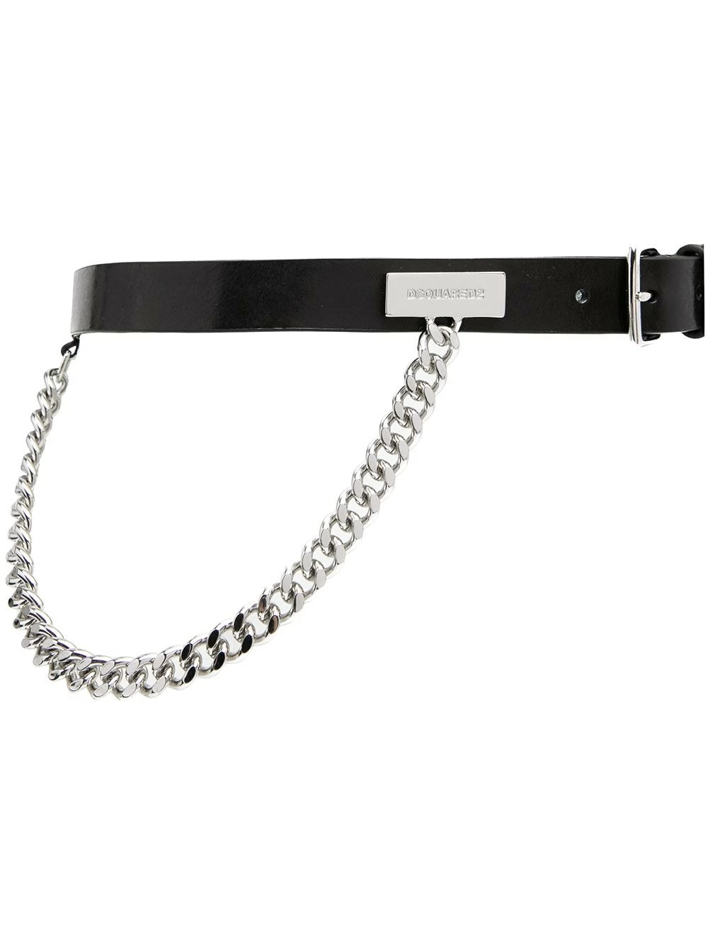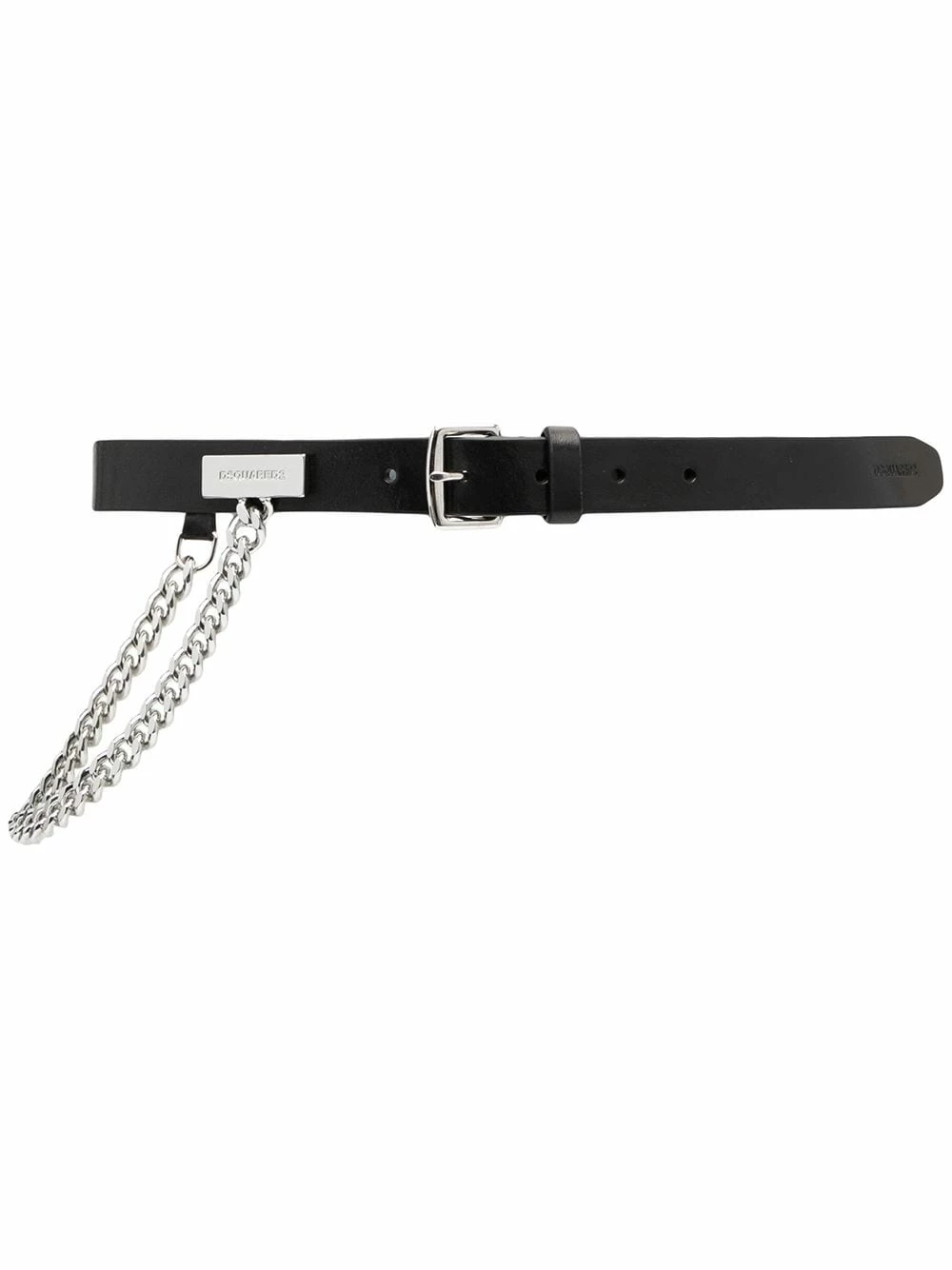 Logo gravé, ornements argentés, fermeture à boucle, taille ajustable, détails de chaînes, plaque logo. Couleur : noir. Matière : cuir.