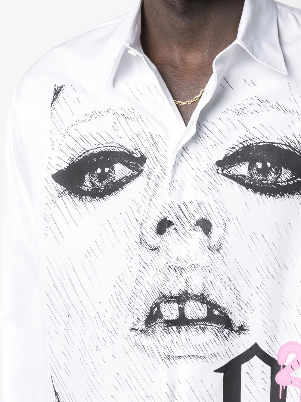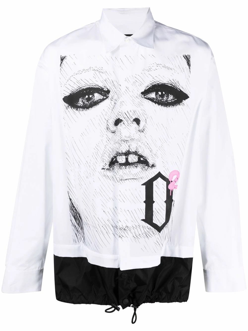 Imprimé graphique, col italien, boutonnière sur le devant, poignets boutonnés, taille à lien de resserrage. Couleur : blanc. Matière : coton.