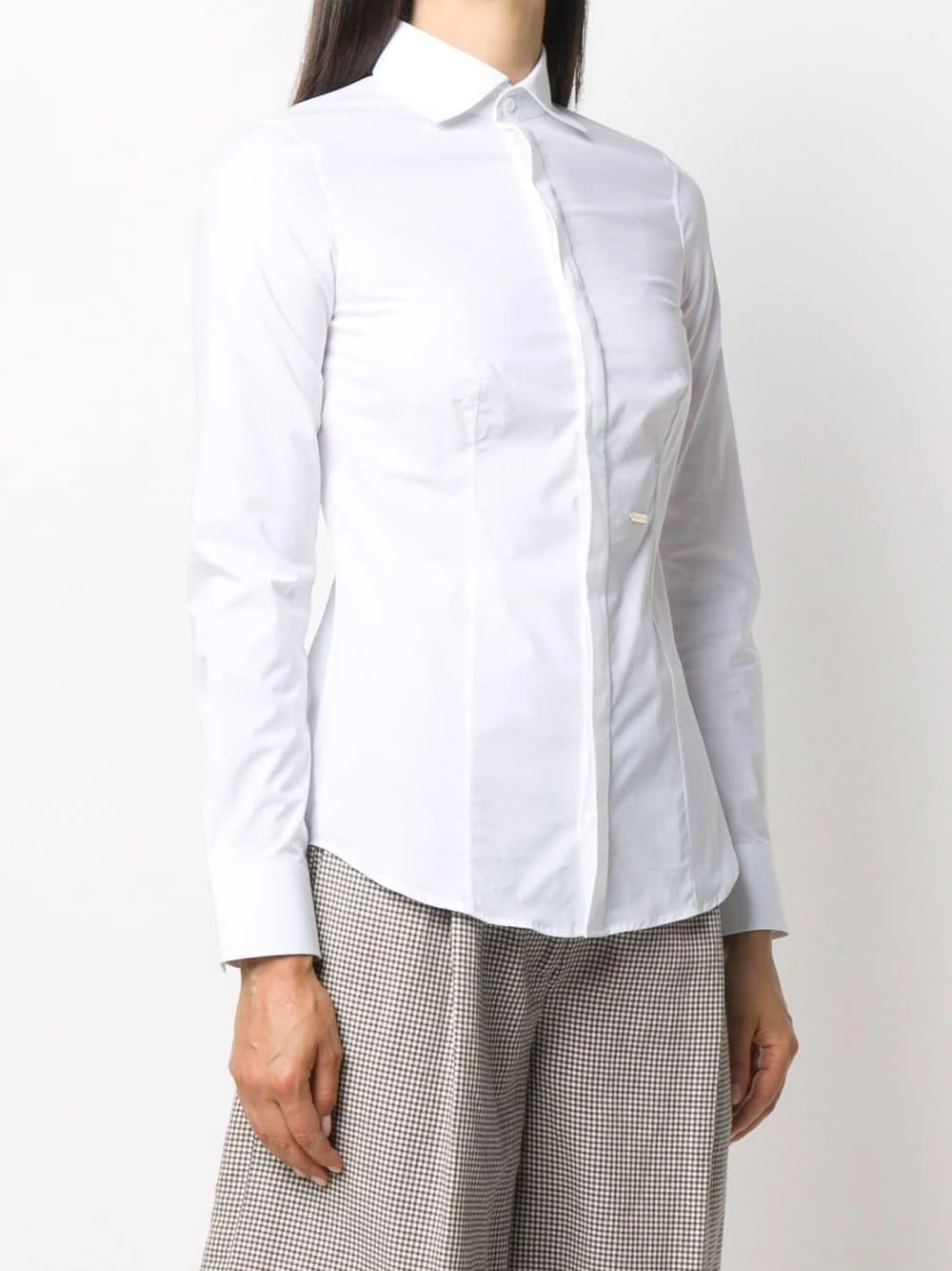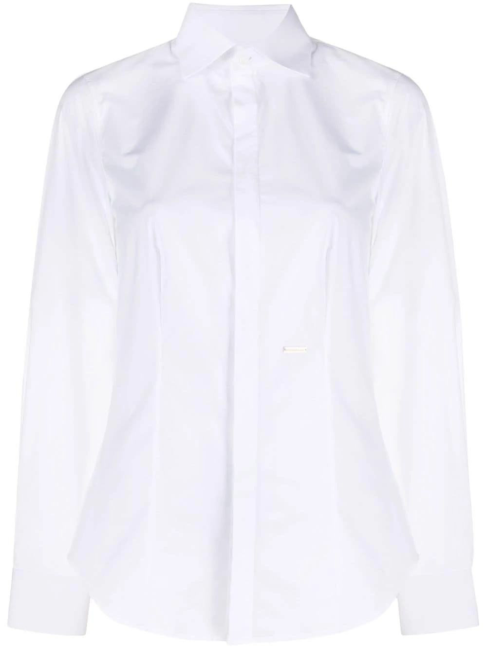 Col pointu, boutonnière sur le devant, manches longues, poignets boutonnés. Couleur : blanc.