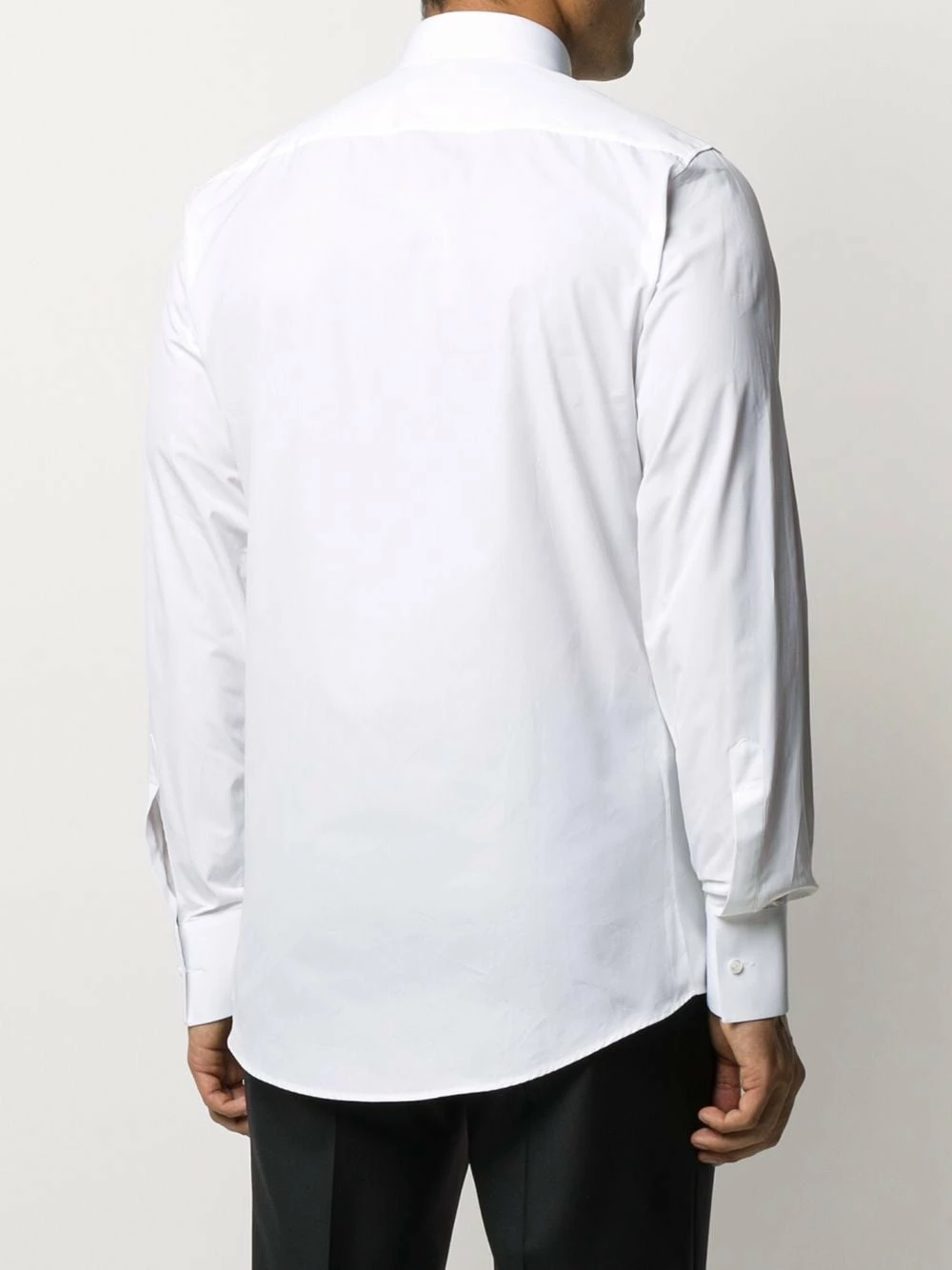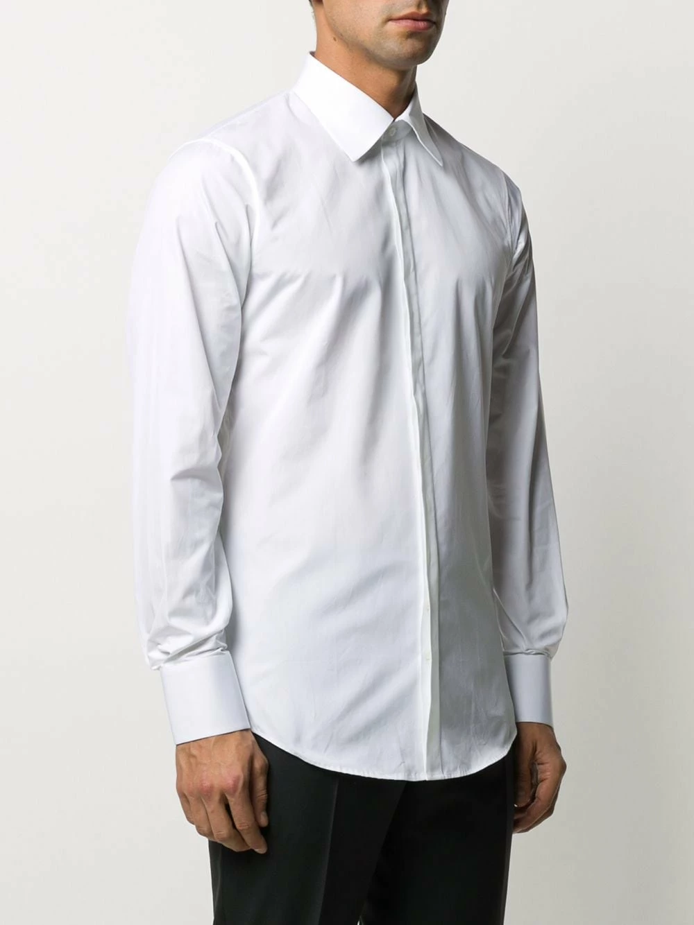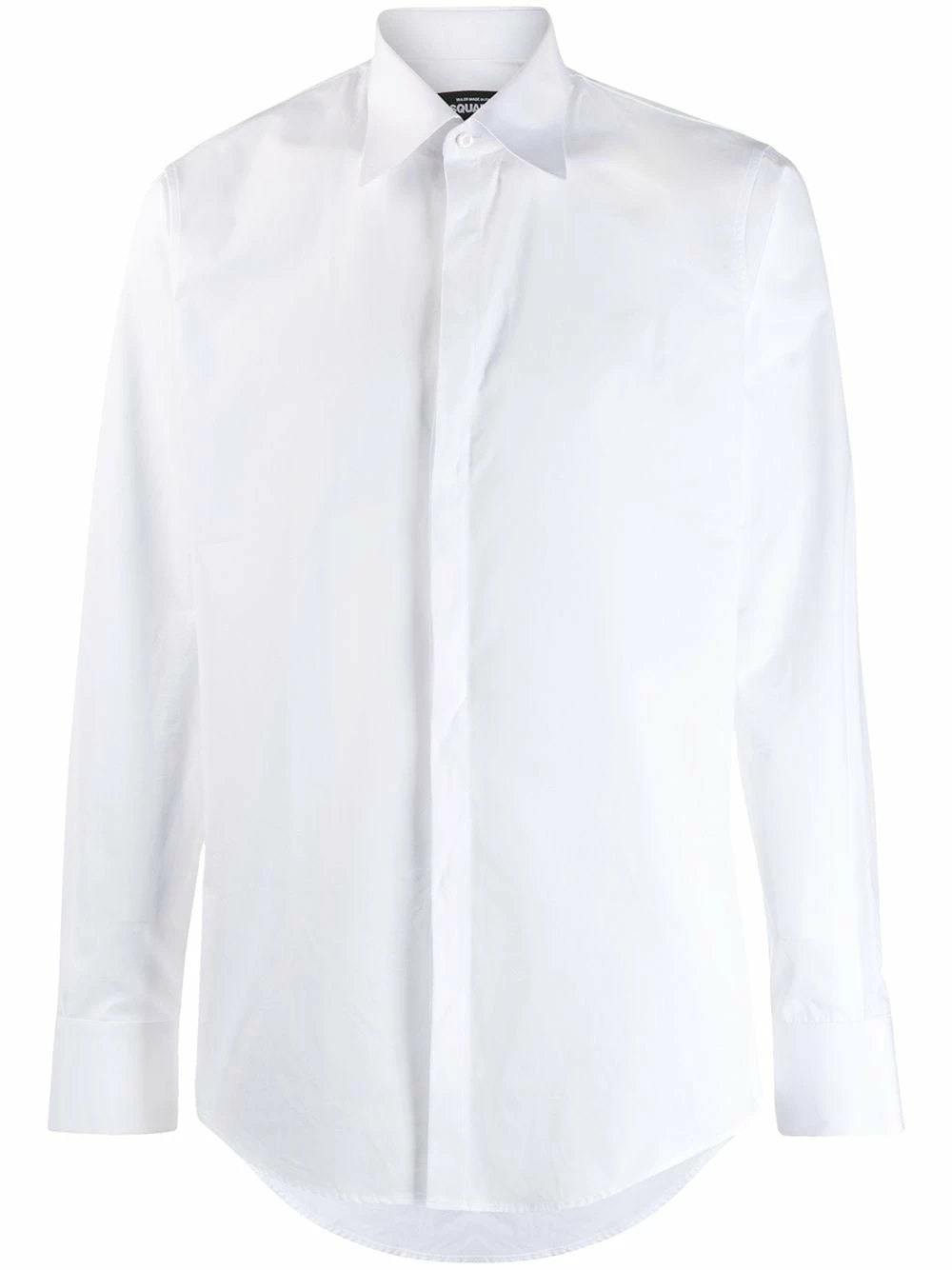 Chemise classique ajustée en coton Dsquared2 avec col pointu, boutonnière dissimulée sur le devant, manches longues, poignets boutonnés et ourlet incurvé. Couleur : blanc.