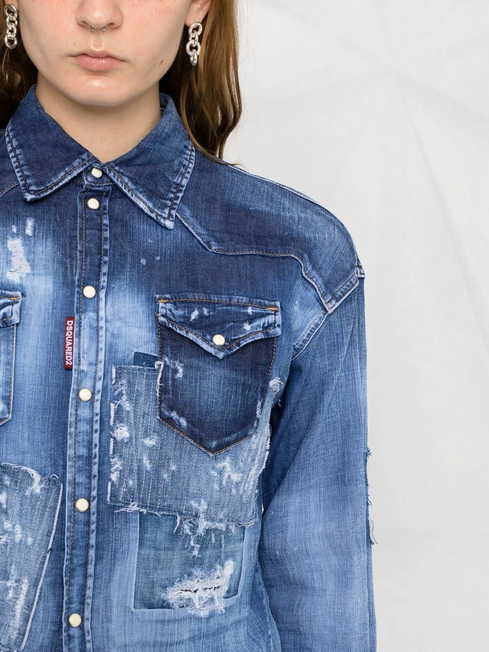 Effet délavé, effet usé, col classique, deux poches poitrine à rabat, fermeture à bouton pression, poignets à boutons pression, ourlet incurvé. Couleur : bleu.