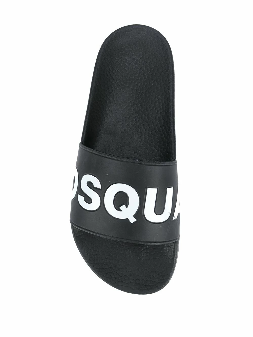 Claquettes à logo noires et blanches Dsquared2 avec bout ouvert, semelle plate en caoutchouc et logo imprimé.