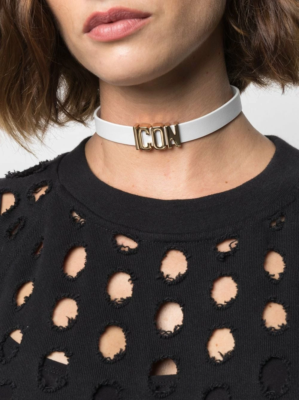 Plaque logo dorée, taille ajustable, maille gourmette. Couleur : blanc.