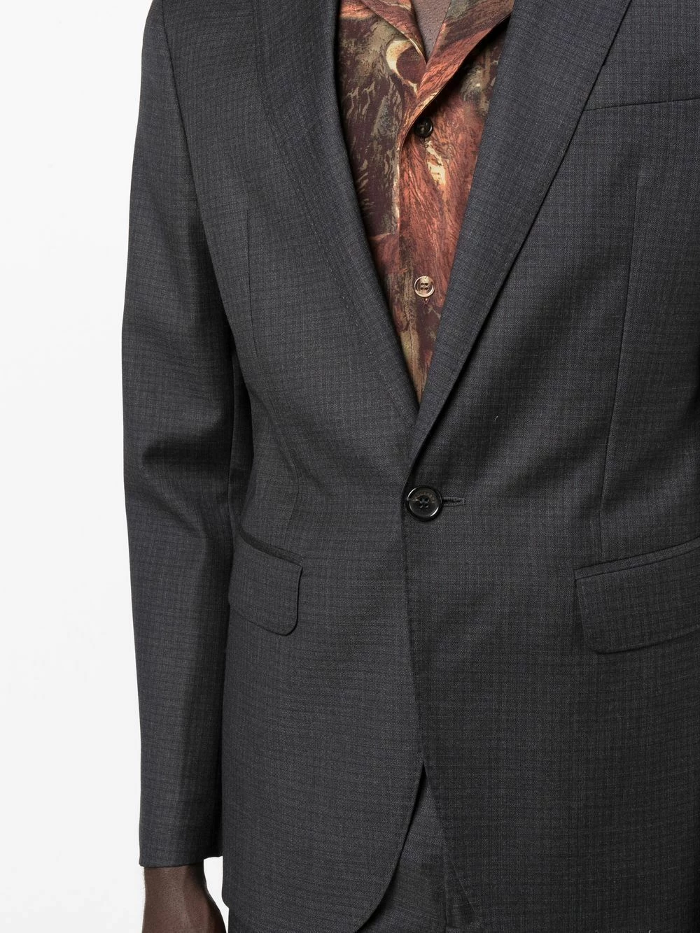 Revers crantés, manches longues, boutonnière sur le devant, deux poches à rabat sur le devant, poches latérales fendues, poche arrière passepoilée, coupe droite.