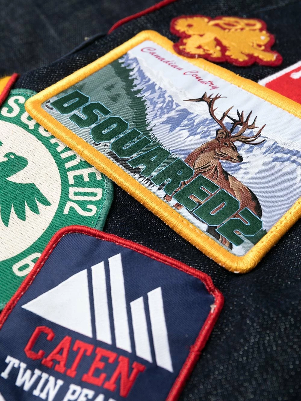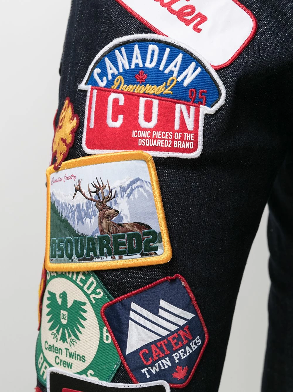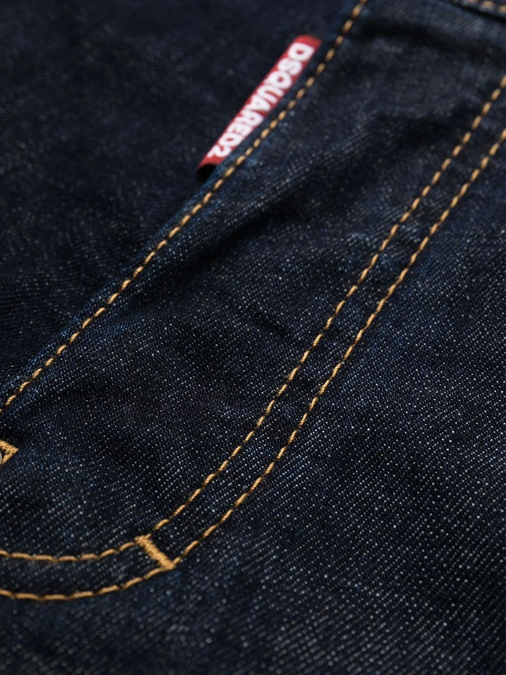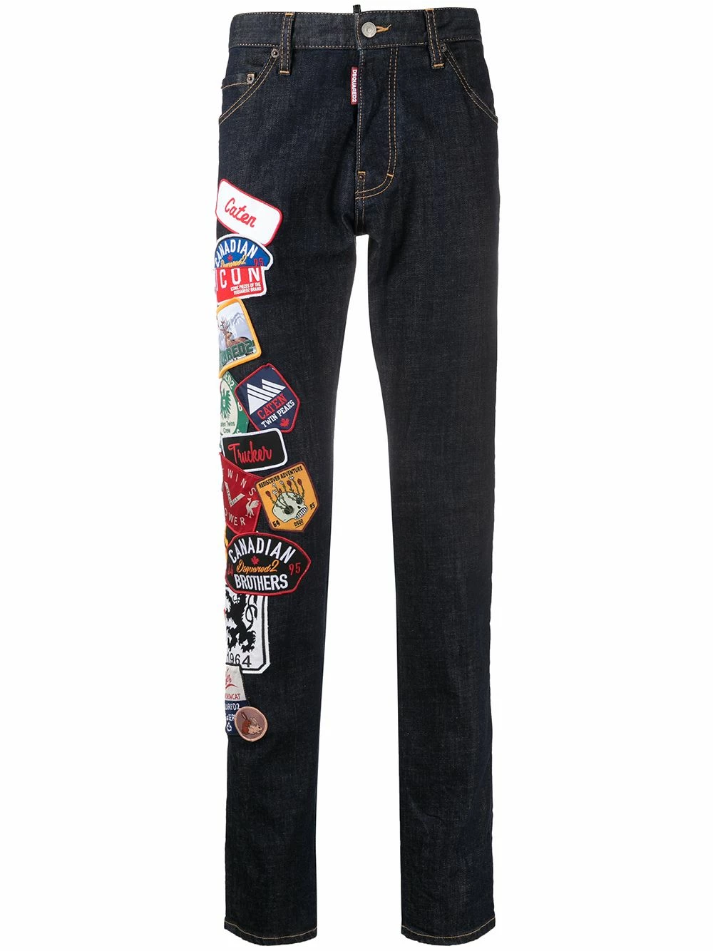 Détail de patch, passants de ceinture, taille mi-haute, boutonnière sur le devant, coupe ajustée, 5 poches classiques.